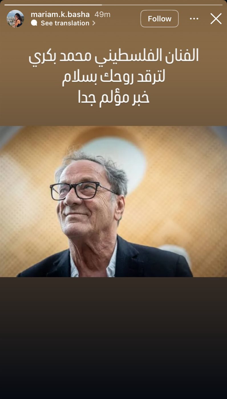 و نشرت مريم الباشا صورة للفنان الراحل عبر حسابها معلقة عليها: "الفنان الفلسطيني محمد بكري لترقد روحك بسلام خبر مؤلم جدا ".