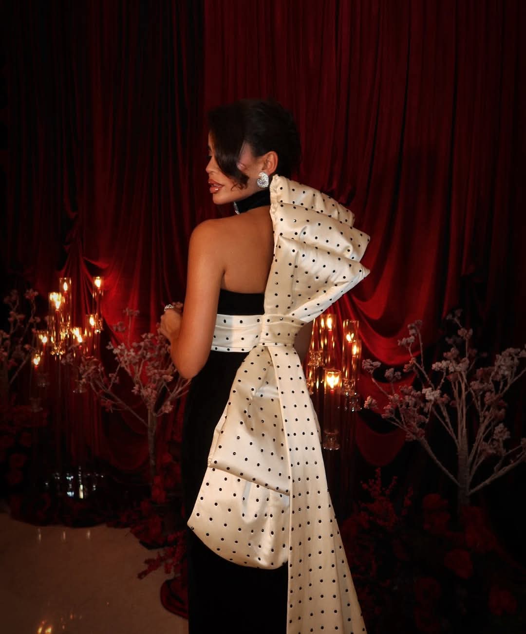 و تميز بوجود فيونكة ضخمة بنقشة البولكا دوتس شكلت عنصرًا لافتًا وجعلت الإطلالة اكثر اناقة وجاذبية