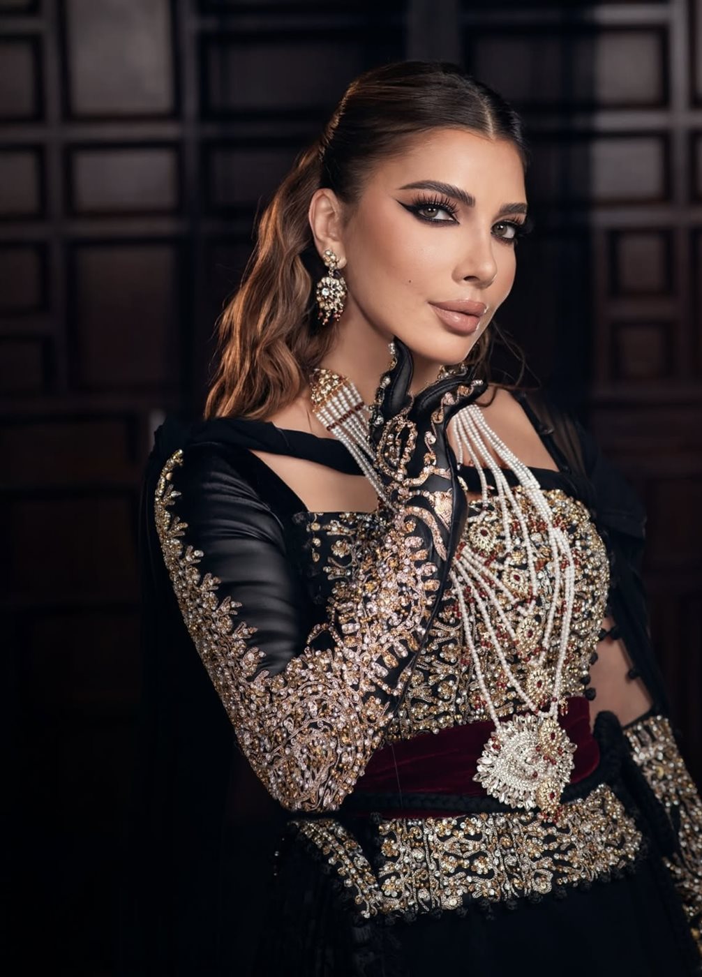 ظهرت أصالة بإطلالة يغلب عليها اللون الأسود، اختير بعناية ليكون قاعدة أنيقة تُبرز غنى التفاصيل والزخارف الذهبية التي زيّنت التصميم وجاء التصميم بتوقيع الدار الكويتية المميزة مهرة . التطريزات الكثيفة والدقيقة امتدت على الصدر والأكمام وحتى القفازات الطويلة، ما منح الإطلالة طابعًا ملكيًا مهيبًا يذكّر بالأزياء التراثية الفاخرة. وجاء القماش الشفاف في بعض الأجزاء ليضيف لمسة أنثوية ناعمة، توازن بين الجرأة والرقي دون إخلال بهيبة التصميم.