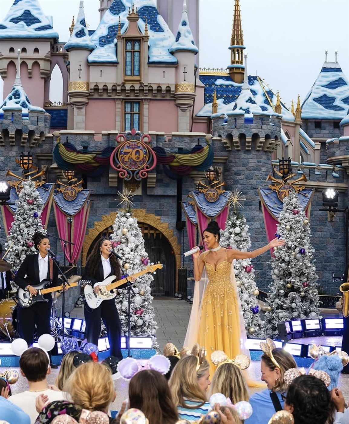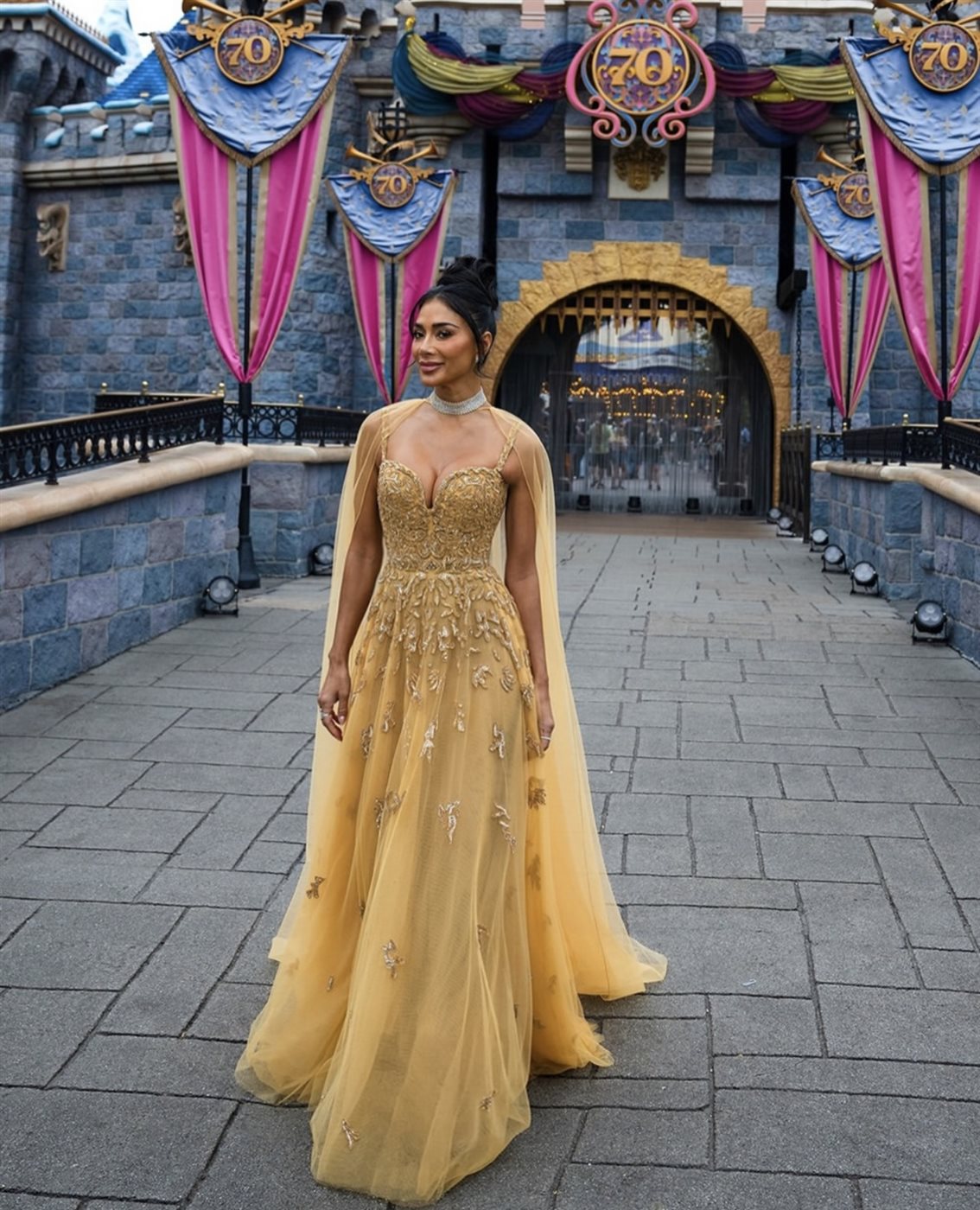 ولم تكتفِ الإطلالة بالفستان وحده، بل اكتملت بكاب متناسق مصنوع من القماش ذاته، ليضفي حضورًا ملكيًا لافتًا على المشهد العام، ويمنح الإطلالة حركة وانسيابية على المسرح. هذا التناغم بين الفستان والكاب عزز من قوة التصميم وجعله مناسبًا للظهور في حدث ضخم بحجم موكب ديزني.