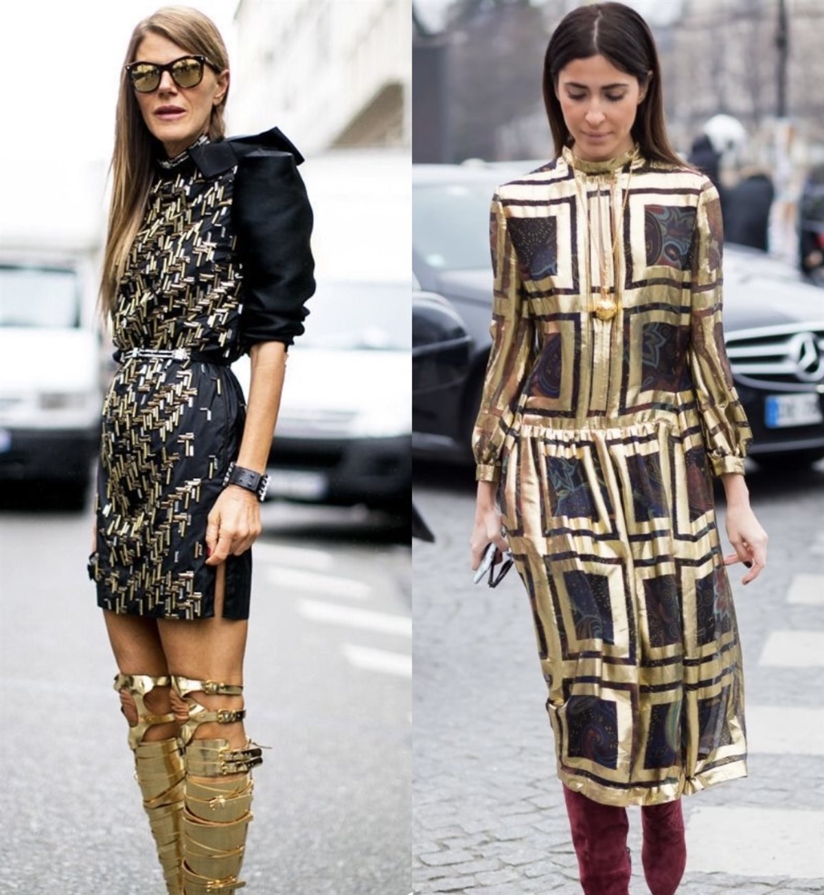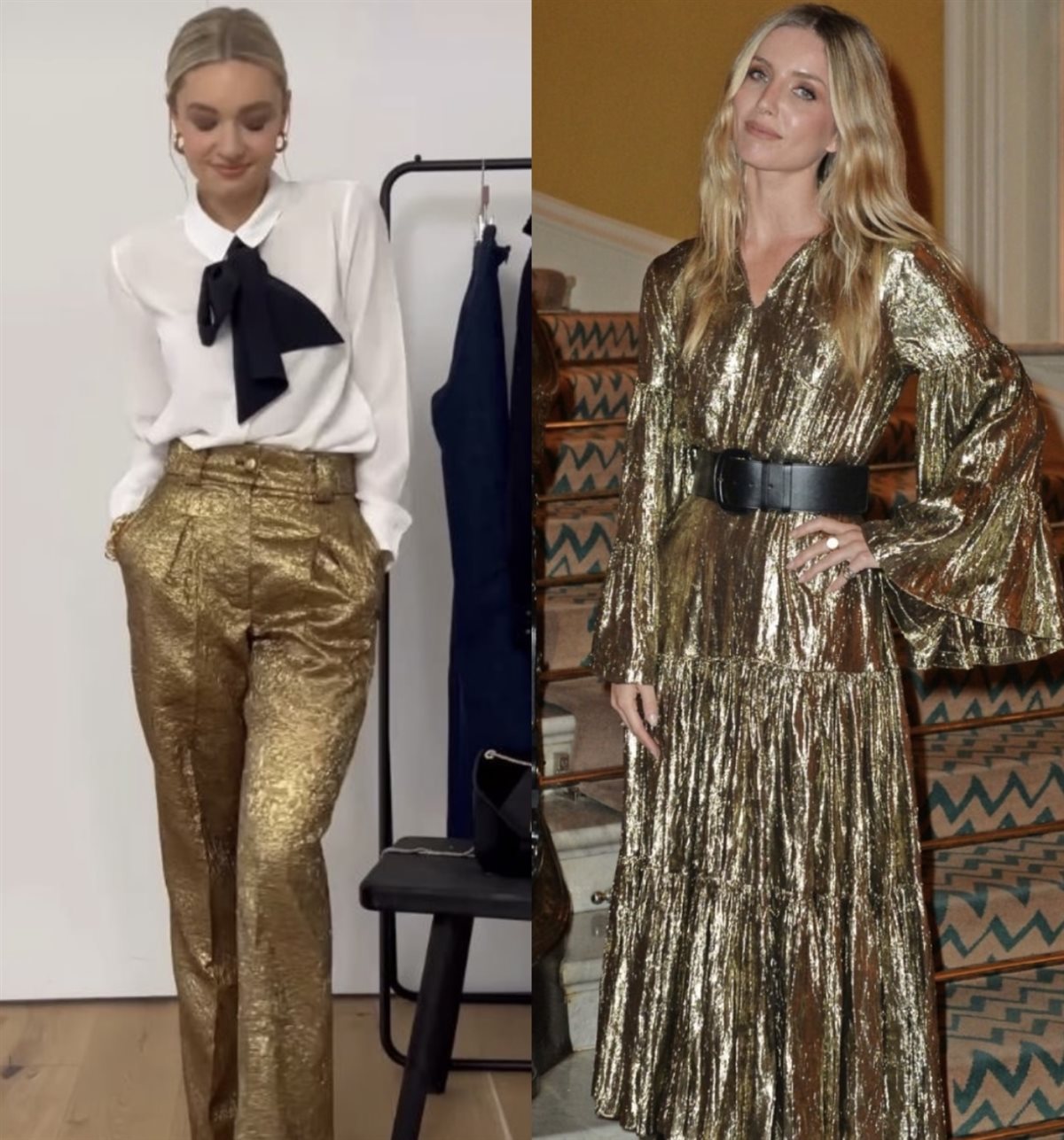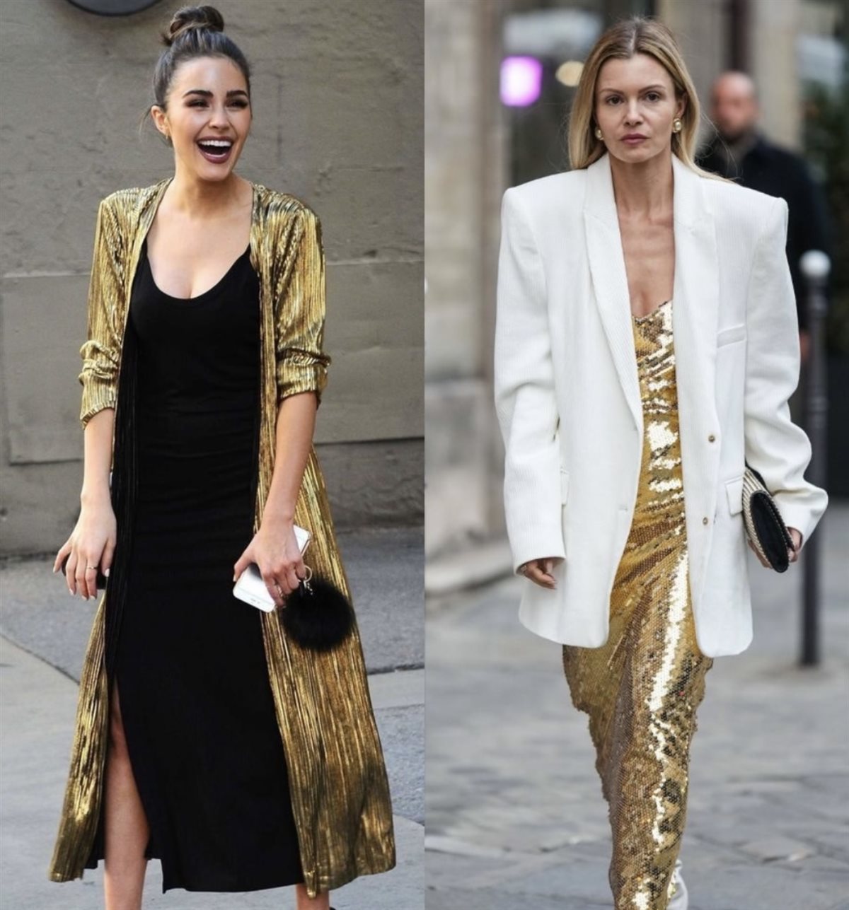 هذا الموسم، نلاحظ تنوّعًا لافتًا في توظيف اللون الذهبي؛ من الفساتين المرصّعة بالترتر اللامع التي تخطف الأنظار في السهرات المسائية، إلى الإطلالات اليومية التي تكتفي بلمسة ذهبية ناعمة عبر الإكسسوارات أو الأحذية المعدنية. الفساتين الذهبية الطويلة أو القصيرة تظلّ الخيار الأبرز لحفلات عيد الميلاد، خاصة تلك المصنوعة من الأقمشة اللامعة مثل الساتان، أو المزدانة بالتطريزات الدقيقة التي تعكس الضوء بطريقة أنيقة دون مبالغة.