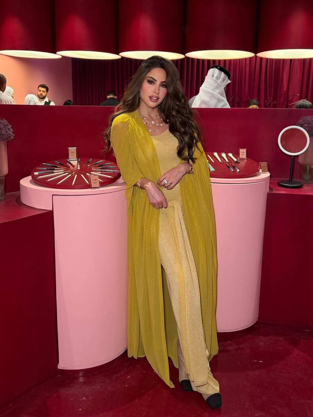 واختارت أن تعلو الفستان بعباءة مفتوحة بتصميم بسيط من علامة Grade X You، ما أتاح للون الأصفر أن يظل العنصر الأبرز في اللوك دون أن يفقد تناغمه العام.