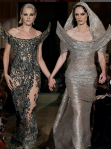 لفتت الفساتين الملونة ذات الأكتاف العريضة الانتباه، كذلك أيضًا الفساتين اللامعة البراقة المميزة بالتطريزات المعدنية.