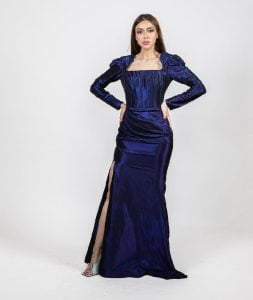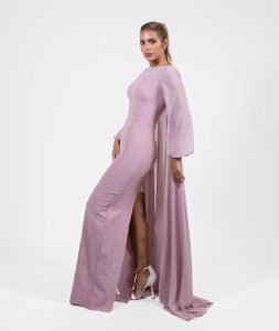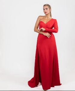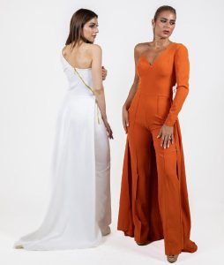 كما اشتملت المجموعة أيضًا على الفساتين ذات الكم الواحد “أوف شولدر”، المميزة بقصة البنطلون من الأمام “جامب سوت” وتنورة خلفية.