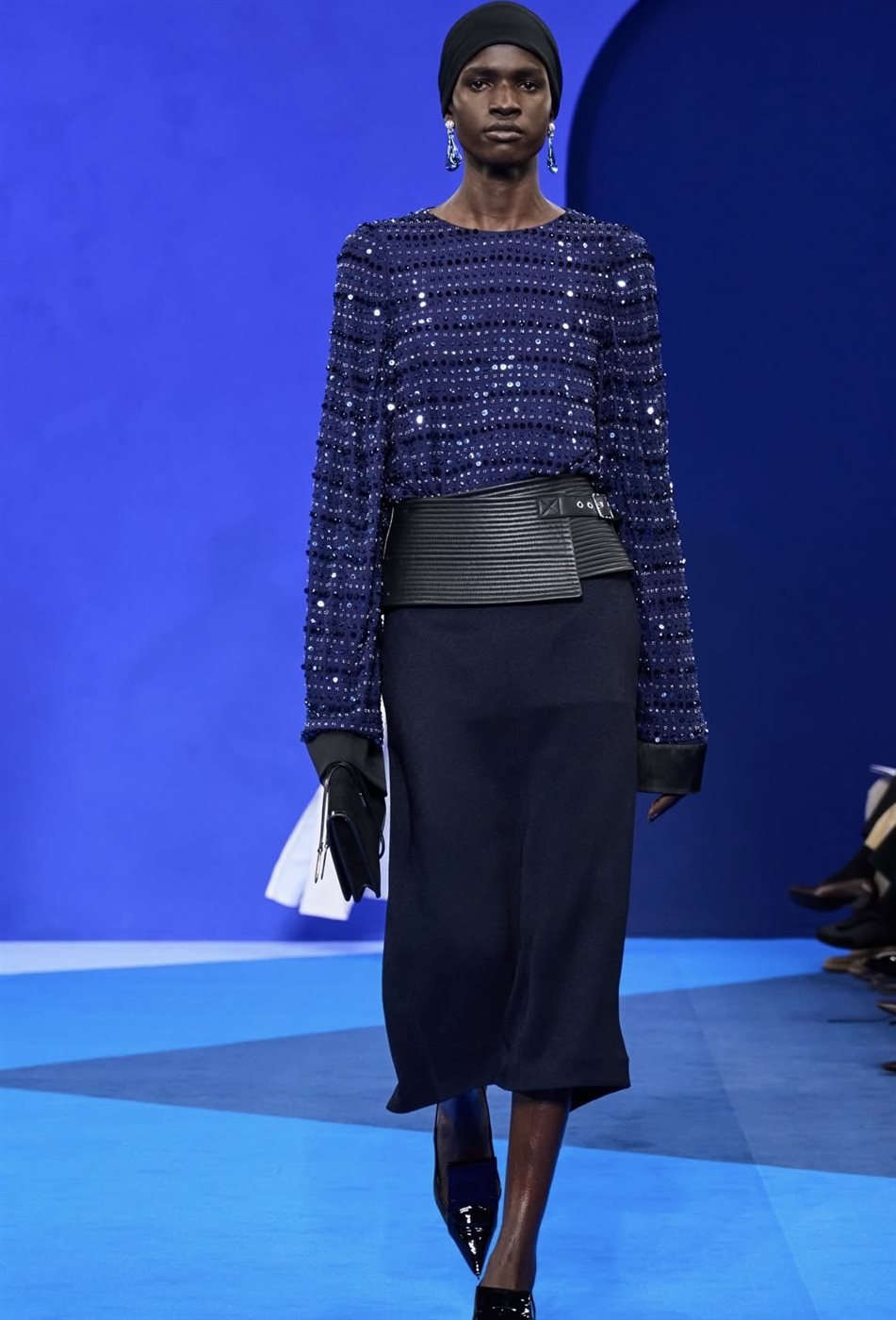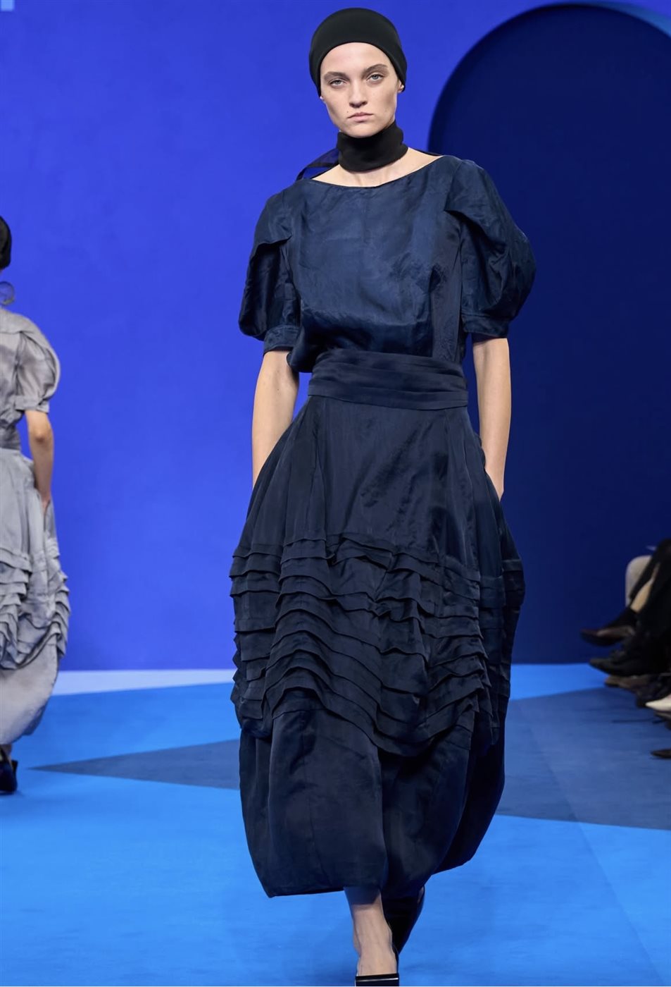 اللون الأزرق كان عنصر الربط البصري بين القطع المختلفة: فظهرت الفساتين والبنطلونات والسترات بتدرجات متناسقة، تتناغم مع بعضها البعض في عرض واحد.