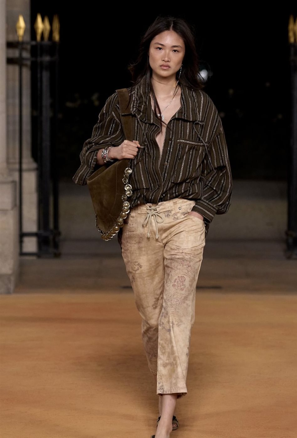 أبرز ما لفت الأنظار كان الفيست المرقع من السويد الذي أُقرن مع الكارجو الزيتية المزدانة بالأحزمة، ليخلق مظهرًا متعدد الطبقات، مدروسًا بعناية، ويعكس خبرة الدار في صياغة إطلالات ذات أبعاد بصرية غنية. أما لوحة الألوان الترابية المتجانسة، فقد عززت الإحساس بالطبيعة والانطلاق الحر، بينما ساهمت القصّات المريحة في تكريس مفهوم ماران عن أنوثة عملية لا تخضع للتقييد.