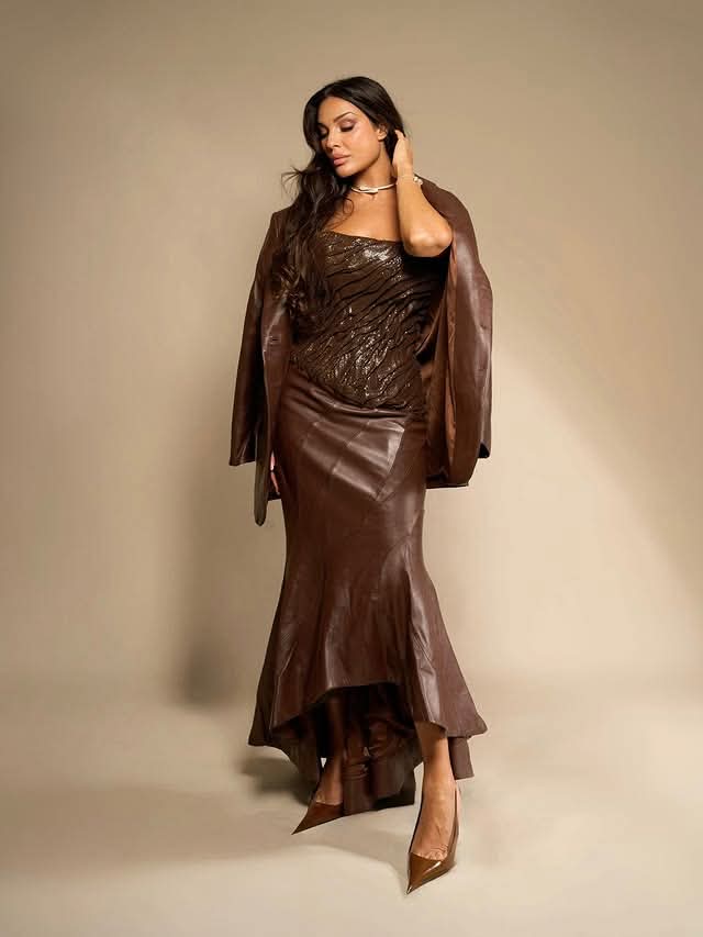 جاءت الإطلالة بالكامل بتدرجات اللون البني، بأسلوب الـ"مونوكروم" الذي يواصل تصدر صيحات الموضة لموسم الخريف 2025. وقد تألفت من ثلاث قطع أساسية: توب لامع يضفي لمسة من الحيوية والجرأة، وتنورة طويلة مصممة بقصة "ذيل السمكة" التي تحتفي بأنوثة القوام وتمنح الإطلالة بعداً درامياً، وسترة جلدية باللون نفسه تُكمل اللوك بطريقة متجانسة.