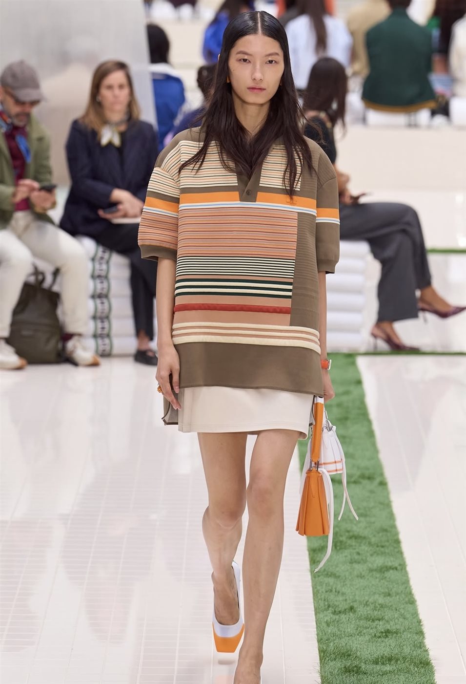 لوحة الألوان كانت نابضة بالحياة، مستوحاة من الملابس الرياضية الكلاسيكية، فغلبت عليها درجات البرتقالي، الأخضر، والأبيض، لتضفي حيوية شبابية وتعبّر عن طاقة الصيف المتجددة. كما أضافت المصممة لمسات فنية عبر تطريزات زهرية رقيقة تجسّد لحظات الفرح والانتصار، في إشارة إلى إرث الدار الذي يجمع بين البساطة والتفرّد.