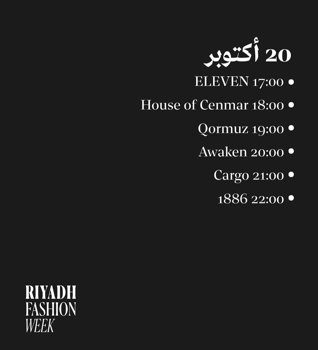 يُسدل الستار على أسبوع الموضة بعروض من علامات صاعدة مثل ELEVEN، وHouse of Cenmar، وQormuz، تليها Awaken وCargo، في تمثيل لنبض المشهد المحلي الصاعد. وتكون الخاتمة مع عرض للعلامة الشهيرة 1886 عند الساعة 22:00، المعروفة بإبداعاتها الجريئة وأسلوبها العصري المتمرد.