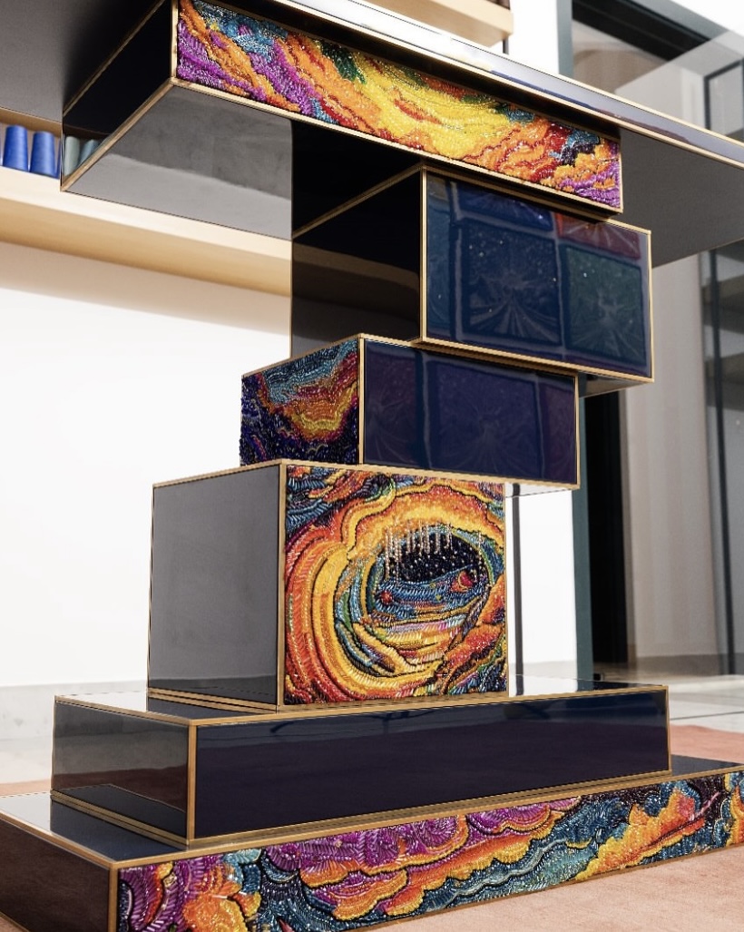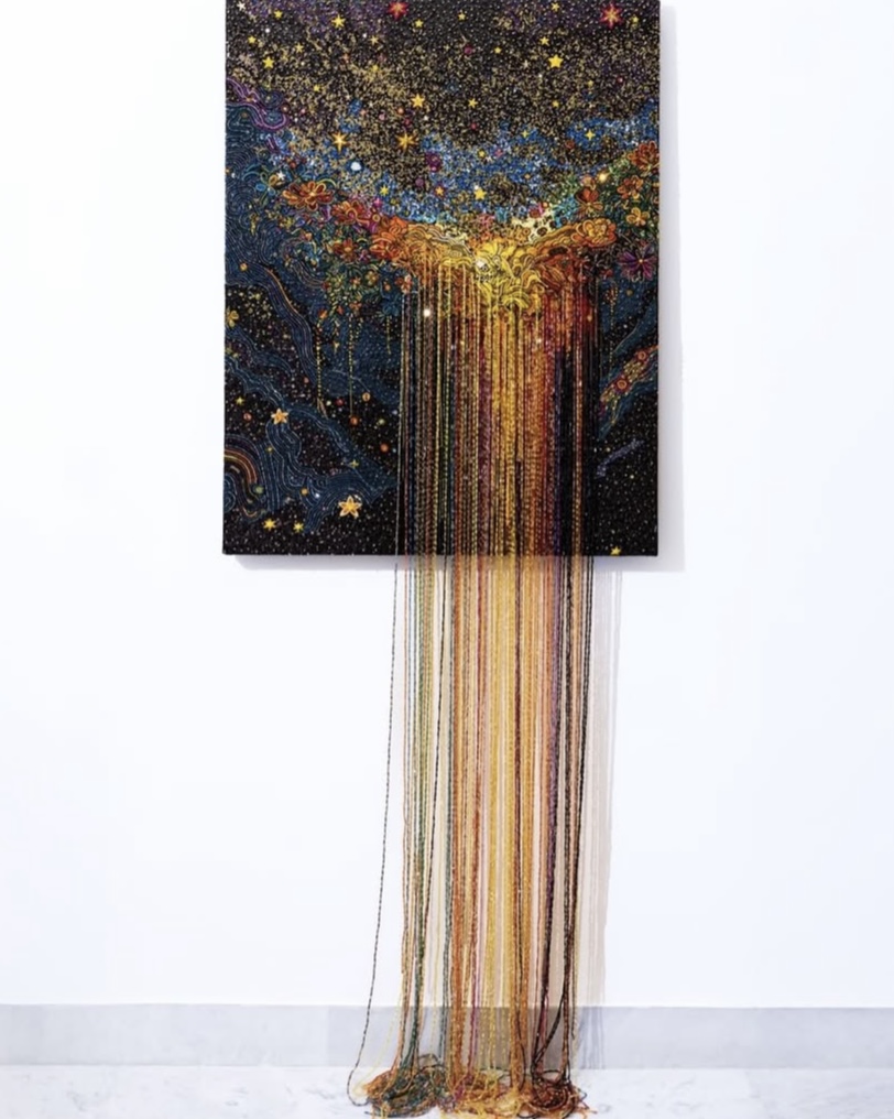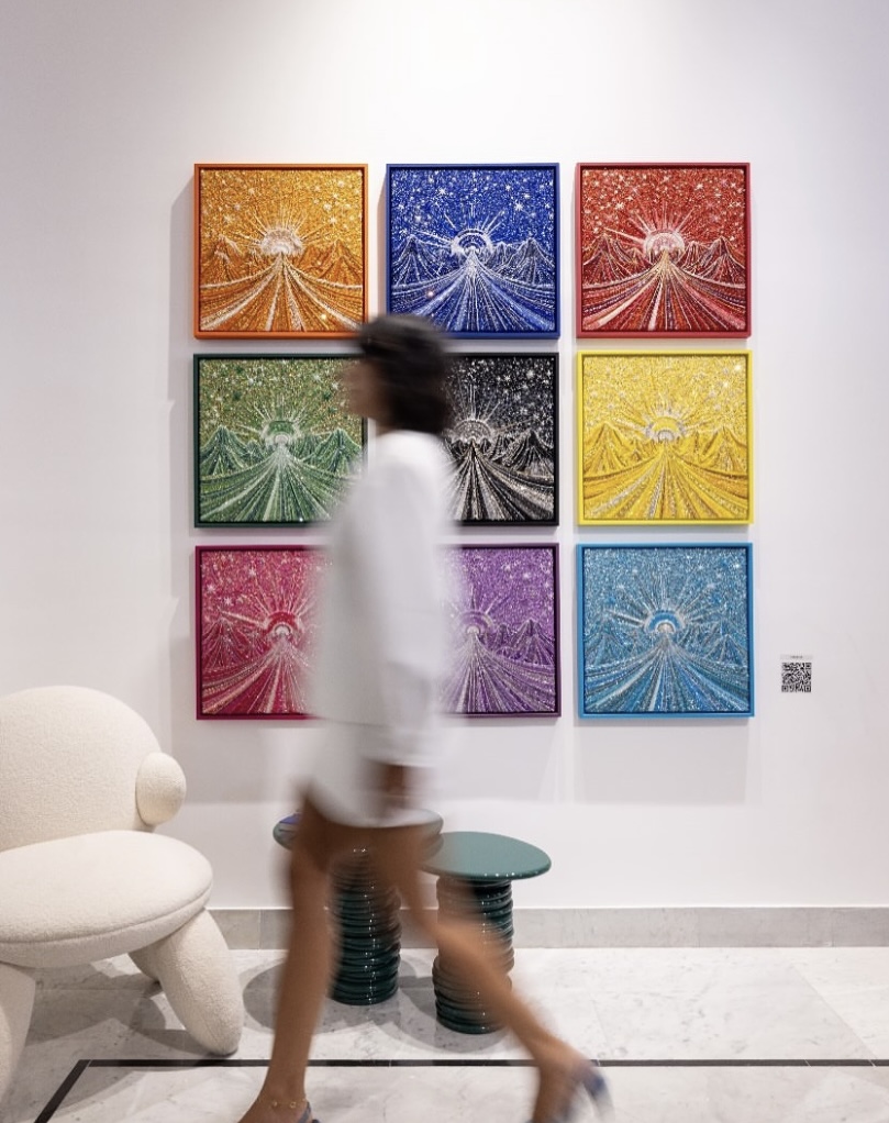 ومن أبرز أعمال المعرض “The Four Seasons of Light” الذي يجسد دورة الضوء والحياة، ولوحة “Cosmic Waterfall” التي تتدفق فيها خيوط الخرز الزجاجي من اللوحة إلى الأرض في مشهد فني ساحر، إلى جانب عمل “Chromium” الذي يتكوّن من تسع ألواح لونية نابضة بالحياة تشكل مجرة متناغمة تعكس وحدة الضوء والطبيعة.