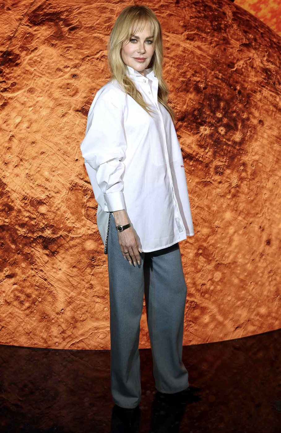 تألقت كيدمان بإطلالة عكست توقيع شانيل الأيقوني، حيث جمعت بين الرقي الهادئ والكلاسيكية العصرية التي تميّز أسلوبها. اختارت إطلالة كلاسيكية بتصميم بسيط حيث قميص ابيض كلاسيكي وبنطلون رمادي بقصة مستقيمة أضفت عليها لمسة من الأنوثة الراقية التي تعبّر عن هوية الدار. وبحضورها المشرق وأناقتها اللافتة، جسّدت النجمة الأسترالية روح شانيل التي تمزج بين الفخامة والتجديد، وتؤكد أن الأناقة ليست في المبالغة بل في التفاصيل التي تلامس الجوهر.