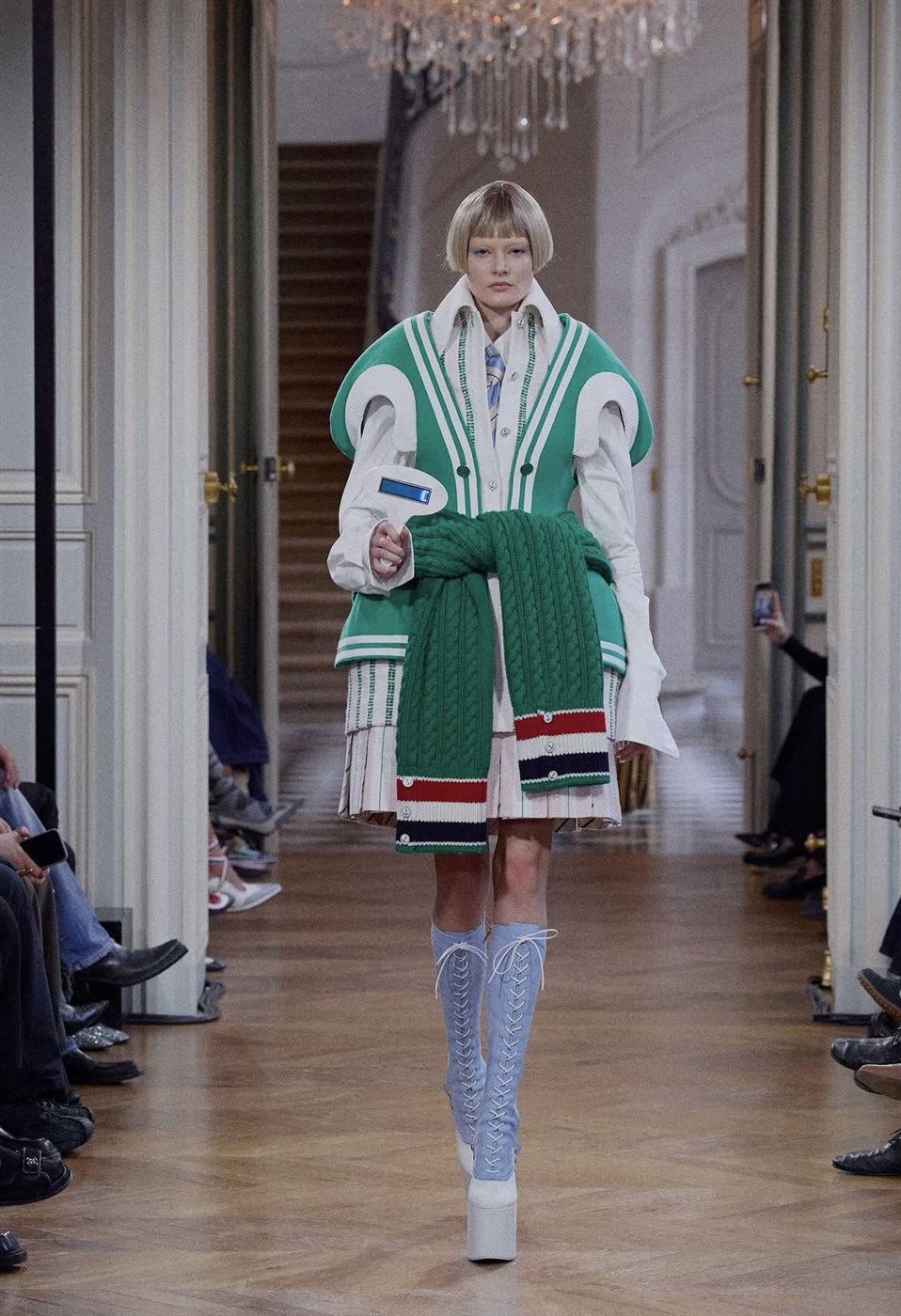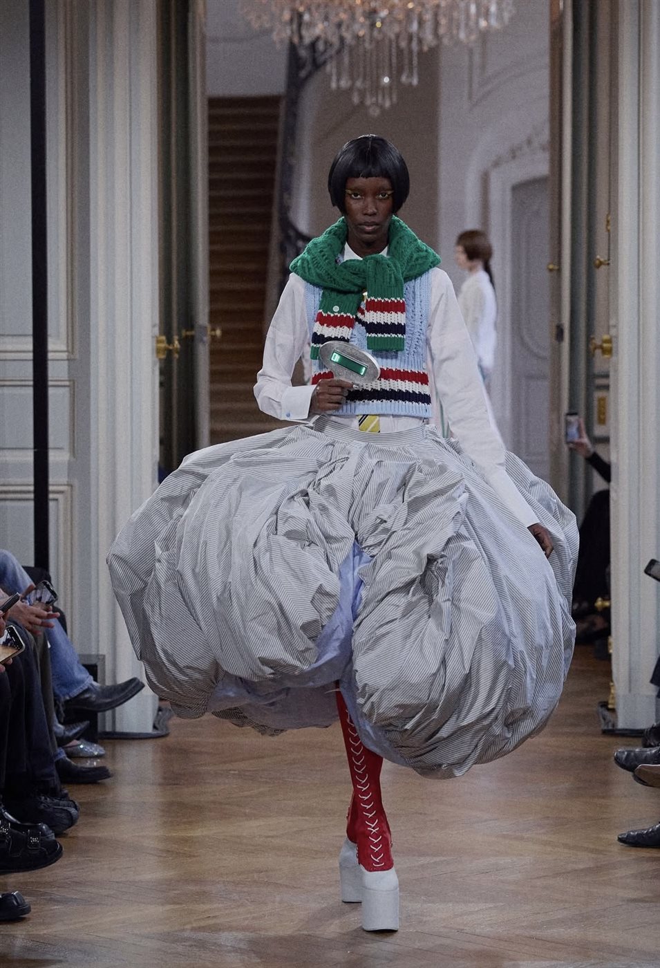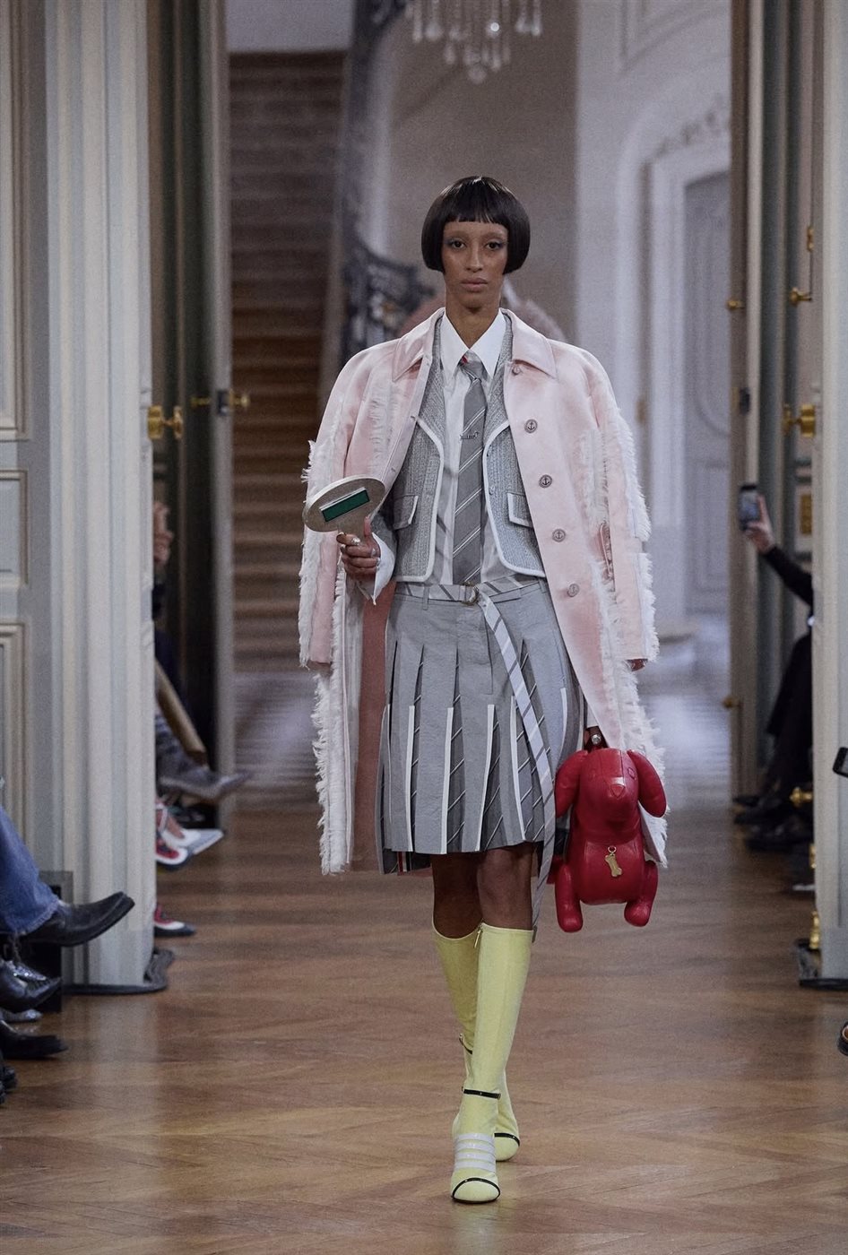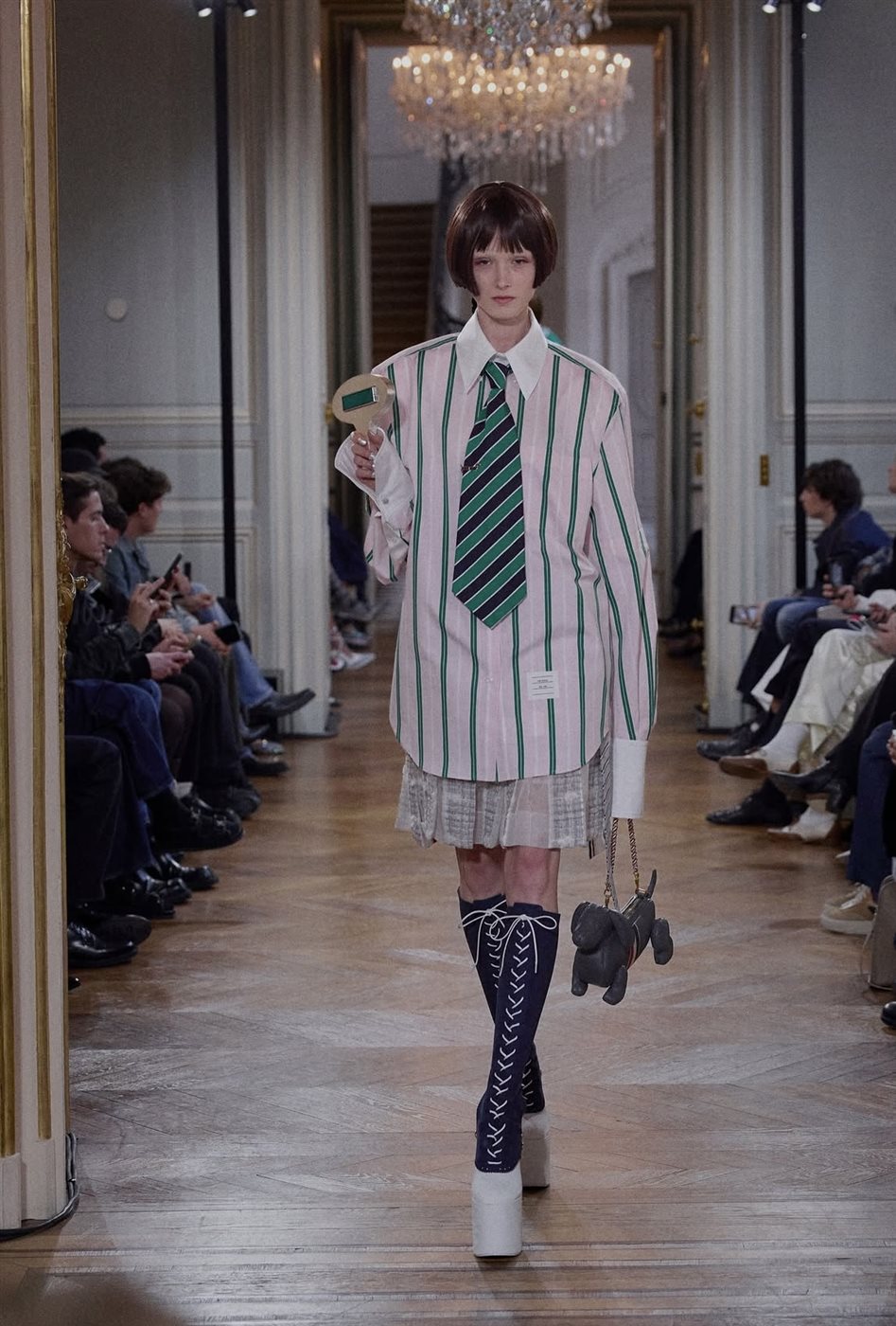 قدّم المصمم الأميركي Thom Browne مجموعة ربيع 2026 في عرض باريسي تحول إلى مشهد سينمائي يخطف الأنظار ، حيث امتزجت هوية الدار الكلاسيكية المستوحاة من زي المدارس الأمريكية مع رؤية مستقبلية صريحة تكاد تُحاكي هبوط كائنات فضائية على المدرج. ارتكز العرض على سرد مسرحي سريالي جعل كل قطعة تبدو كقطعة من عالم آخر من بدلات التويد التقليدية إلى تنانير مطرزة وأذرع إضافية وزينة لامعة توحي بأن التصاميم صُمِّمت لأجسام ليست بشرية بالضرورة.