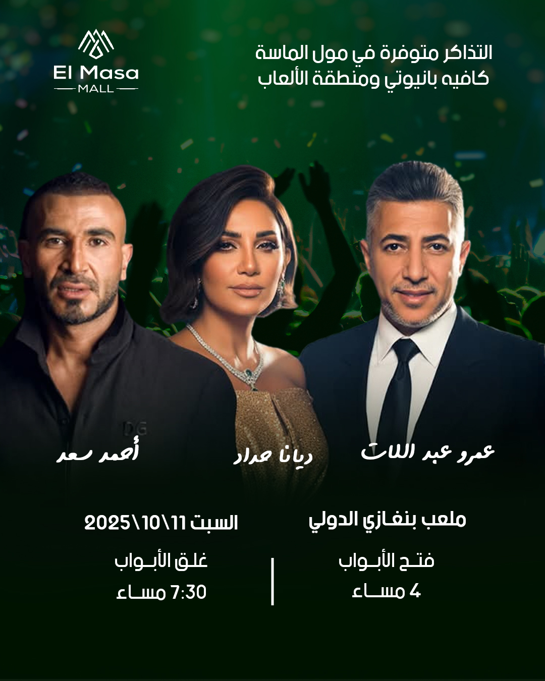 غدًا.. حفل ضخم يجمع أحمد سعد وعمر عبداللات وديانا حداد في ملعب بنغازي الدولي بليبيا