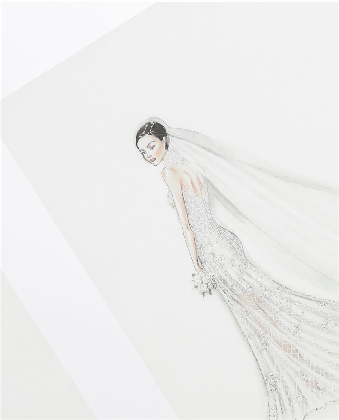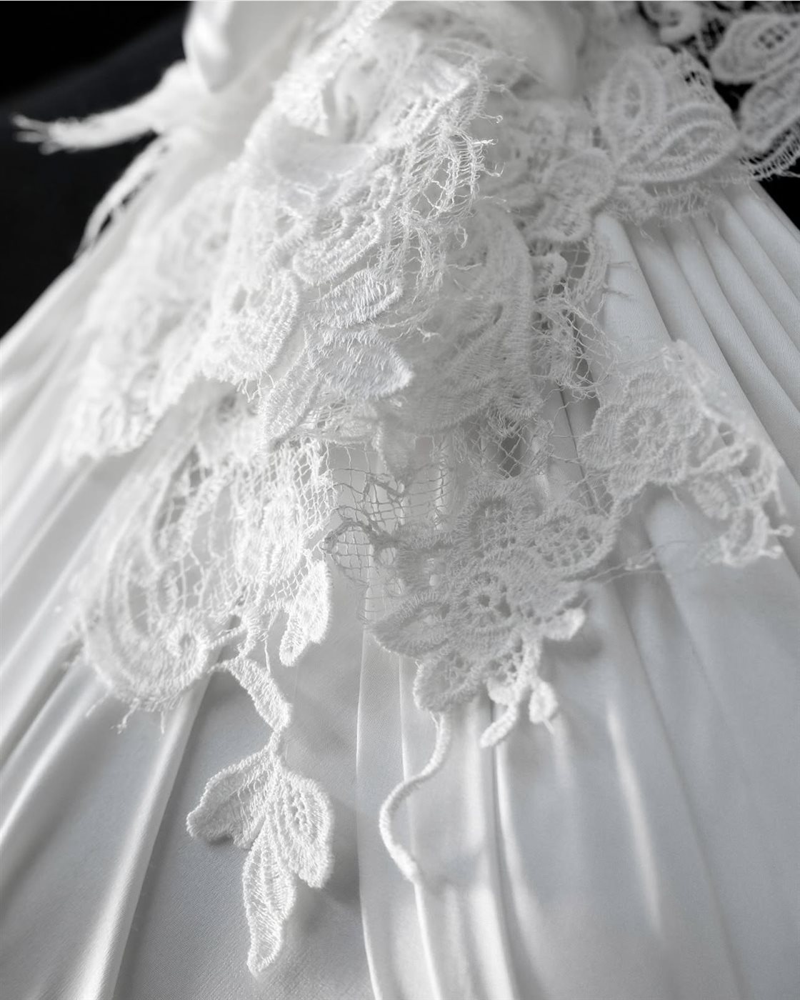 اختارت غوميز ثلاث إطلالات من مجموعة RLCollection المخصصة، عبّرت من خلالها عن أسلوب يجمع بين الرقيّ والأنوثة الكلاسيكية. الإطلالة الأولى كانت بفستان زفاف استثنائي مصنوع من الحرير والدانتيل الفاخر، تميّز بتصميم كورسيه مرسوم يدويًا ومزيّن بتطريزات دقيقة من الكريستال والدانتيل. وقد زيّن ذيل الفستان الطويل أكثر من 300 زهرة دانتيل يدوية على شكل قلوب صغيرة، حملت بين خيوطها لمسة شخصية فريدة، إذ نُقشت عليها أحرف الزوجين وتاريخ الزفاف بتطريز خاص، ما أضفى على التصميم بُعدًا عاطفيًا وشاعريًا نادر الحدوث في فساتين الزفاف الحديثة.