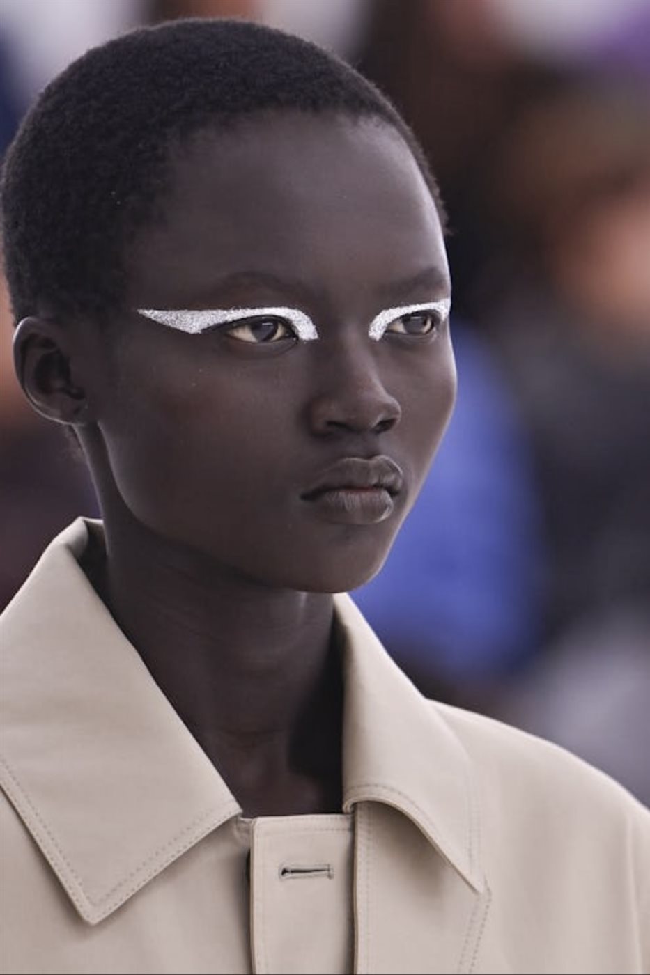 من الرموش الملونة إلى الأيلاينر المشوش والغرافيكي، تميّزت بعض العروض بإطلالات جريئة للعين. على سبيل المثال، في باريس، رأينا “ أعين فضائية ” مع مساحيق معدنية تُضفي طابعًا مستقبليًّا على الوجه.