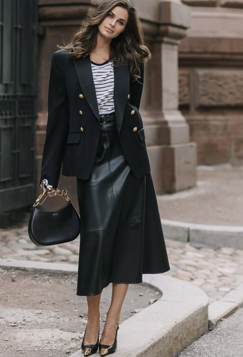 فالتنورة الجلدية تمنح من ترتديها مزيجاً من الثقة والجرأة والرقيّ، وتُعد خياراً مثالياً للانتقال من إطلالة نهارية مريحة إلى أخرى مسائية أنيقة دون عناء. يمكن تنسيقها بعدّة طرق، منها اعتمادها مع تيشيرت قطنية بيضاء وحذاء رياضي لإطلالة كاجوال أنيقة، أو مع قميص حريري وبوت طويل لإطلالة أكثر فخامة تناسب عشاء المساء، بينما تمنحها السترة الجلدية أو البليزر البنّي أو الرمادي لمسة من القوة العصرية التي تعكس شخصية واثقة ومتحرّرة.