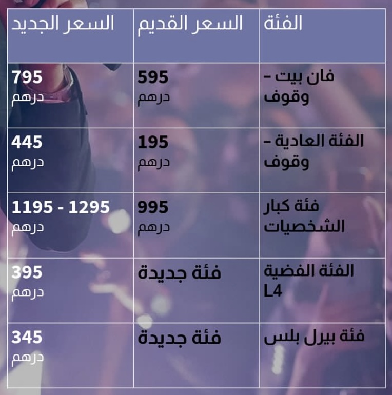 الحفل الذي تم الإعلان عنه من أسبوعين وطرح تذاكره بثلاث فئات فقط تبدأ من 200 حتى الف درهم، تغيرت فجأة تسعيرته، واصبحت اقل تذكرة تكلفتها 450 درهم وحتى 1300 درهم، مع طرح فئتين أخريتين .