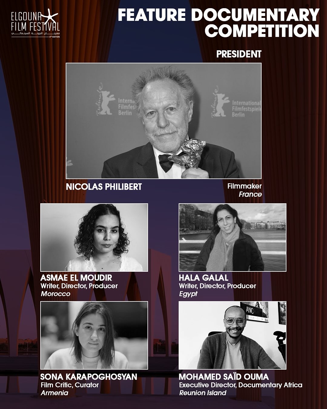 يرأس المخرج الفرنسي نيكولا فليبير لجنة تحكيم مسابقة الأفلام الوثائقية الطويلة، وتضم اللجنة في عضويتها: المخرجة المغربية أسماء المدير، والناقدة السينمائية الأرمينية سونا كارابوغوسيان، ومحمد سعيد أوما المدير التنفيذي لـ«ديكومنتري إفريقيا» من جزيرة لا ريونيون، والمخرجة والمنتجة المصرية هالة جلال.