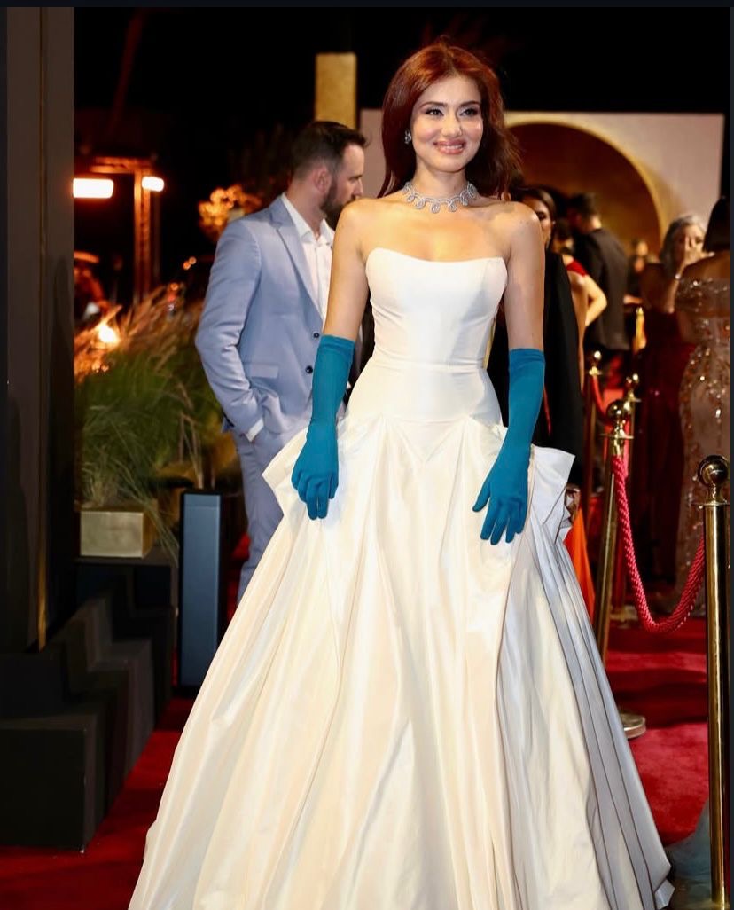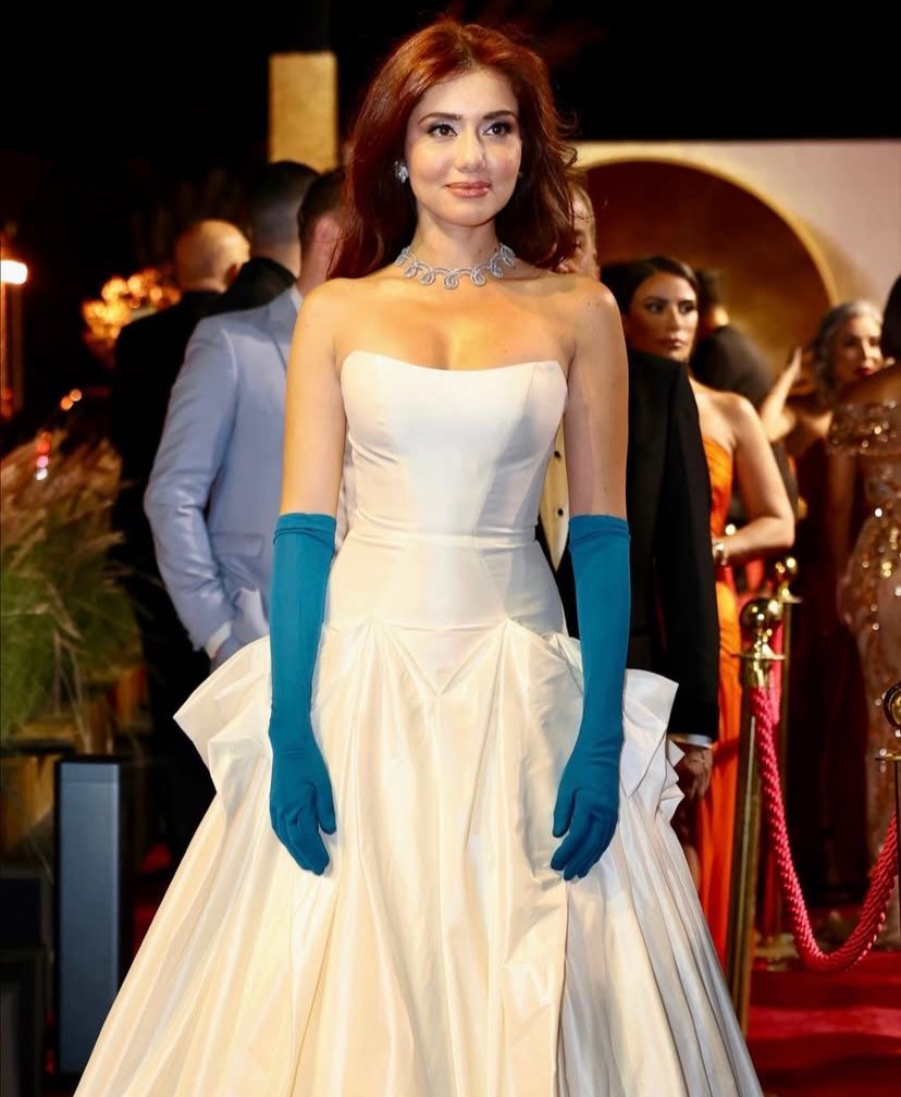ولم تكتفِ جيهان بتفاصيل الفستان فحسب، بل أضافت إليه لمسة مبتكرة عبر قفازات طويلة باللون الأزرق الفيروزي، جاءت لتكسر حيادية اللون وتمنح الإطلالة بعداً فنياً جريئاً يذكّر بأجواء هوليوود الكلاسيكية في خمسينيات القرن الماضي. هذه الإضافة غير المتوقعة جعلت إطلالتها مختلفة عن باقي النجمات، وجعلت الكثير من المصورين يسلّطون عدساتهم عليها لحظة مرورها على السجادة الحمراء.