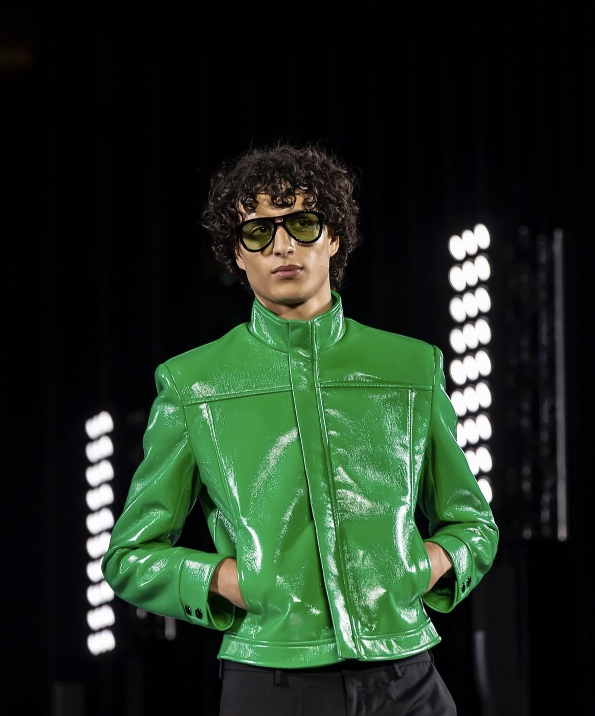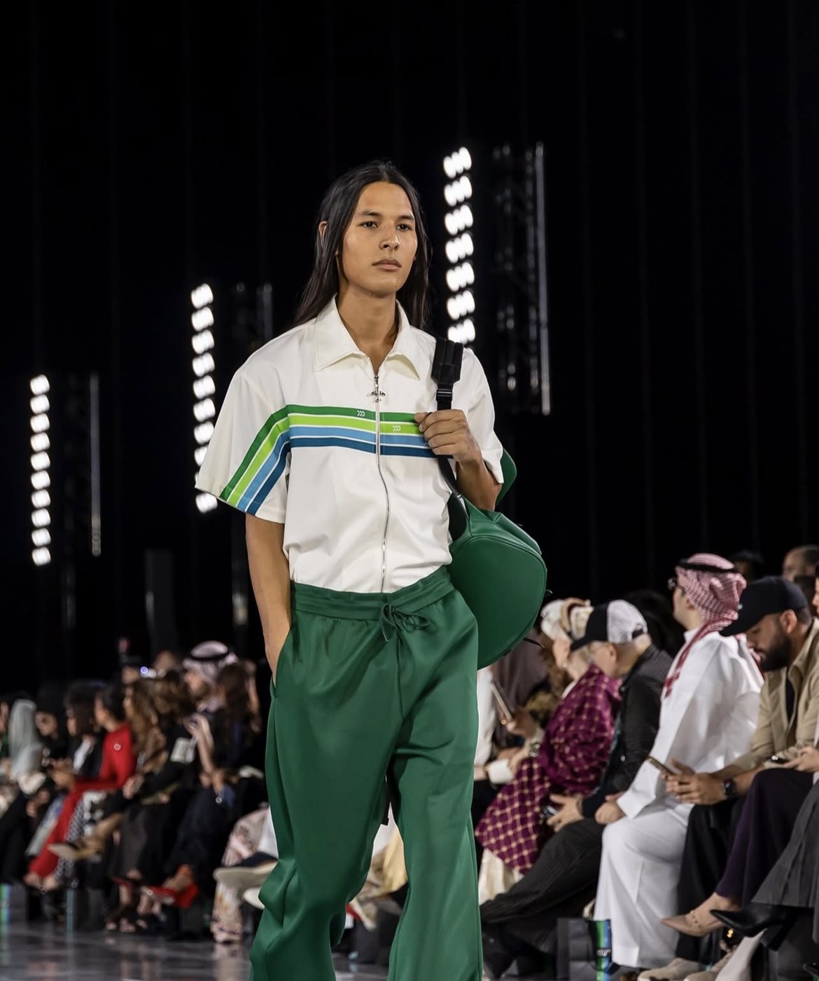 ومن بين أبرز ما لفت الأنظار: سترات بومبر جلدية خضراء بنقوش جرافيكية تُشبه شارات الطيران، وسترات بيسبول بشعارات “جناح” أو رقم الطراز، وبدل رياضية تتدرج فيها الدرجات من التركواز إلى الأزرق السماوي كما لو أنها مأخوذة من منظر نافذة الطائرة أثناء الرحلة.