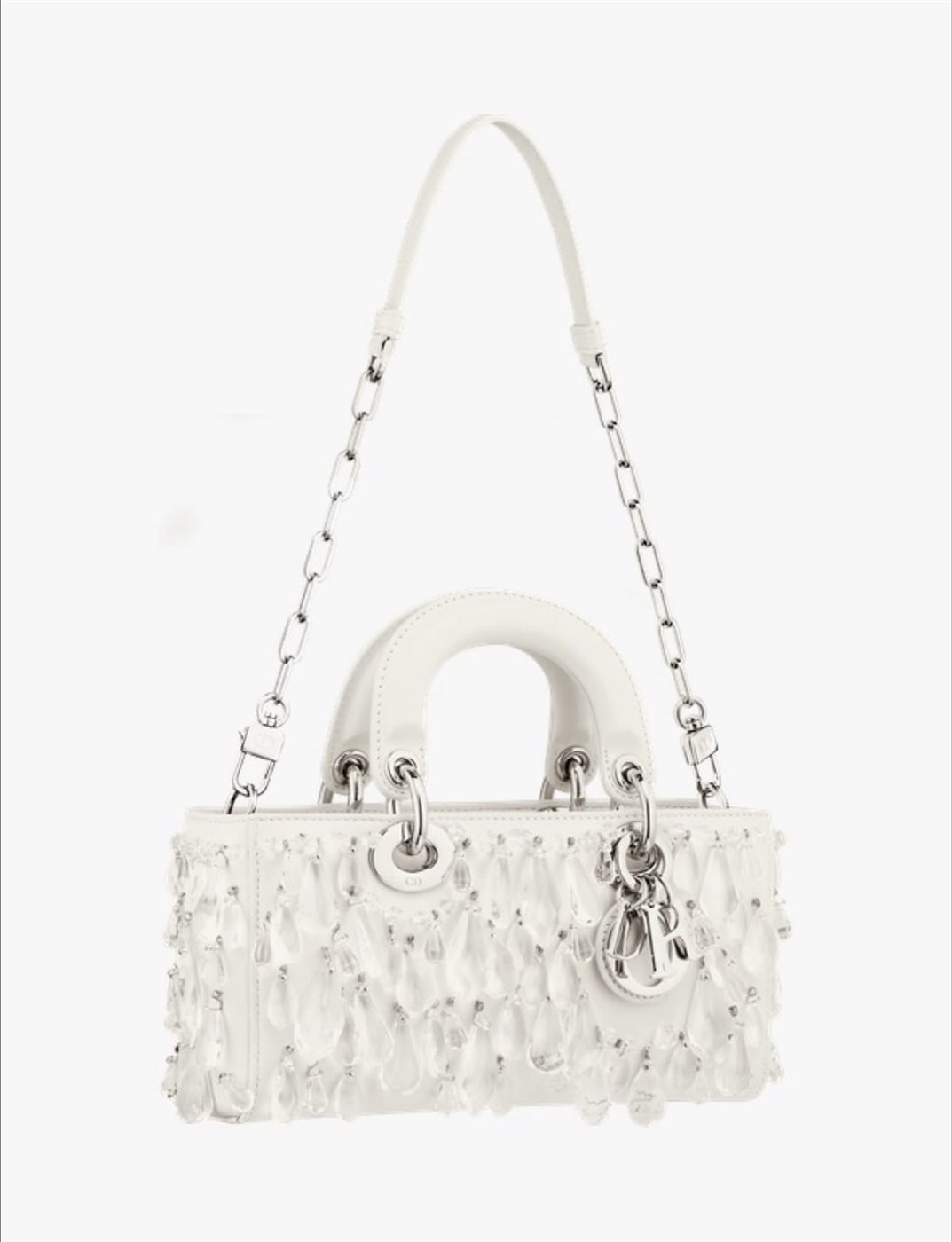 تزدان الحقيبة بلمسات مدهشة من “القطرات الشفافة” التي تم تنفيذها بدقة متناهية لتبدو كأنها ندى كريستالي يستقر فوق سطح الجلد، يعكس الضوء بانسيابية لافتة تُضفي إحساسًا بالحياة والنعومة في آنٍ واحد. هذه التفاصيل الدقيقة ليست مجرد عناصر زخرفية، بل هي امتداد لفكرة “الجمال في التفاصيل”، التي تمثل حجر الأساس في تصميمات Dior منذ تأسيسها على يد كريستيان ديور عام 1946.