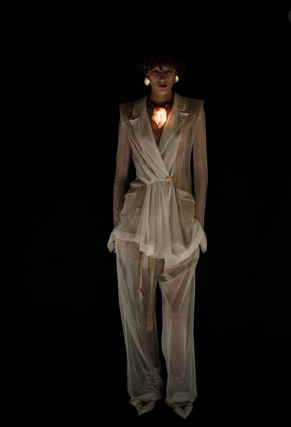 اختارت النجمة إطلالة من تصميم دانيال روزبيري (Daniel Roseberry)، المدير الإبداعي لدار Schiaparelli، جاءت عبارة عن سترة درابية من قماش الجيرسيه الأبيض الشفاف، تتدلّى بنعومة على جسدها وتغلق بزر ذهبي فاخر يرمز إلى النقاء الممزوج بالقوة. ونسّقت معها سروالًا واسعًا بقصّة مخروطة (pegged) يمنحها حضورًا أنثويًا معاصرًا يعكس التوازن بين الكلاسيكية والجرأة.