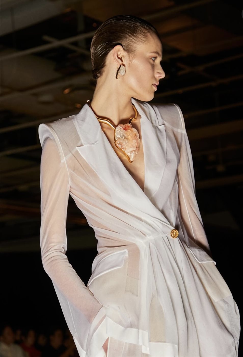 أما الإكسسوارات فكانت بمثابة توقيع فني للدار: أقراط حجرية مستوحاة من حجر الملح الطبيعي تعكس الضوء بنعومة، وعقد مطلي بالذهب من النحاس الأصفر يعزّز فخامة الإطلالة، في حين حملت حقيبة جلدية بنية مزدانة بتصميم فريد ليد ذهبية معدنية تلتف حول أصابعها في حركة رمزية تُجسّد مفهوم “اليد في اليد” الذي تشتهر به Schiaparelli كتعبير عن التواصل بين الإنسان والفن.