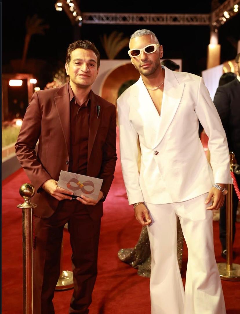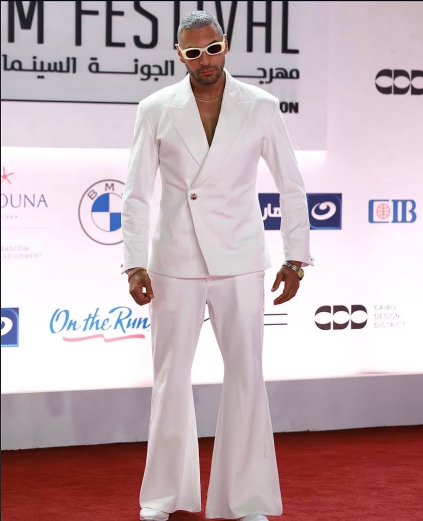 البدلة جاءت باللون الابيض ، مزجت بين الكلاسيكية والعصرية والجرأة ، مع قميص بسيط منح التوازن المطلوب بين الجرأة والأناقة. ونسّق معها حذاء بتصميم فني لافت ليُكمل إطلالته الاستعراضية، التي تحمل بصمته الخاصة في كل مناسبة فنية يحضرها.