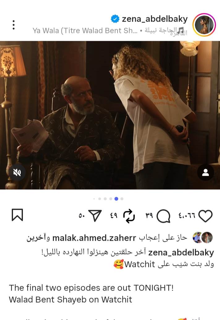 “آخر حلقتين هينزلوا النهارده بالليل، ولد وبنت وشايب على Watchit”.