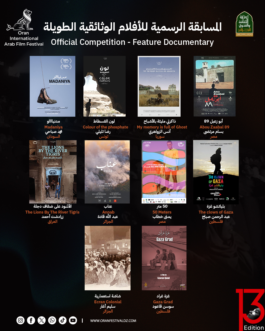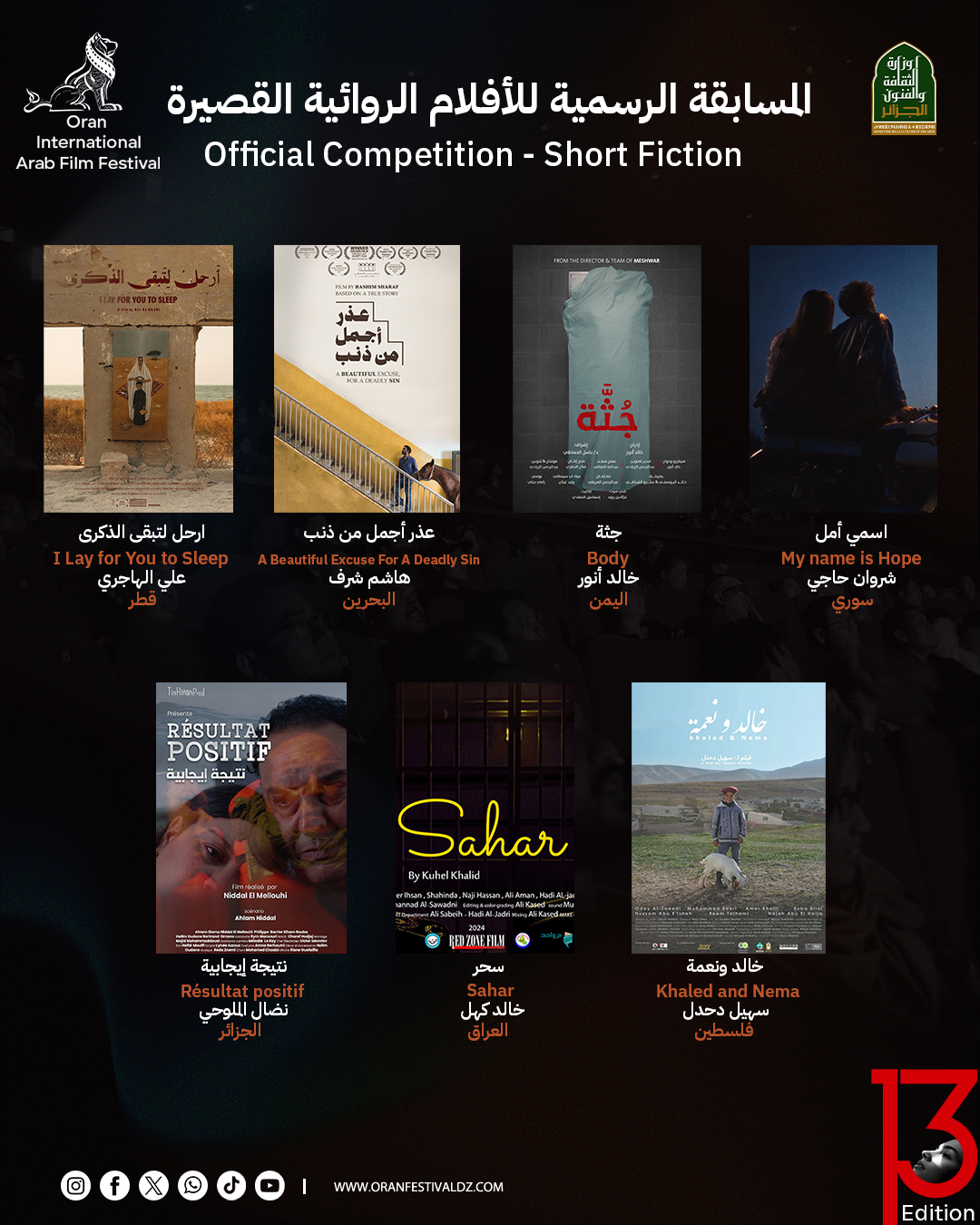القائمة الكاملة للأفلام المشاركة في مهرجان وهران للفيلم العربي بدورته الـ13