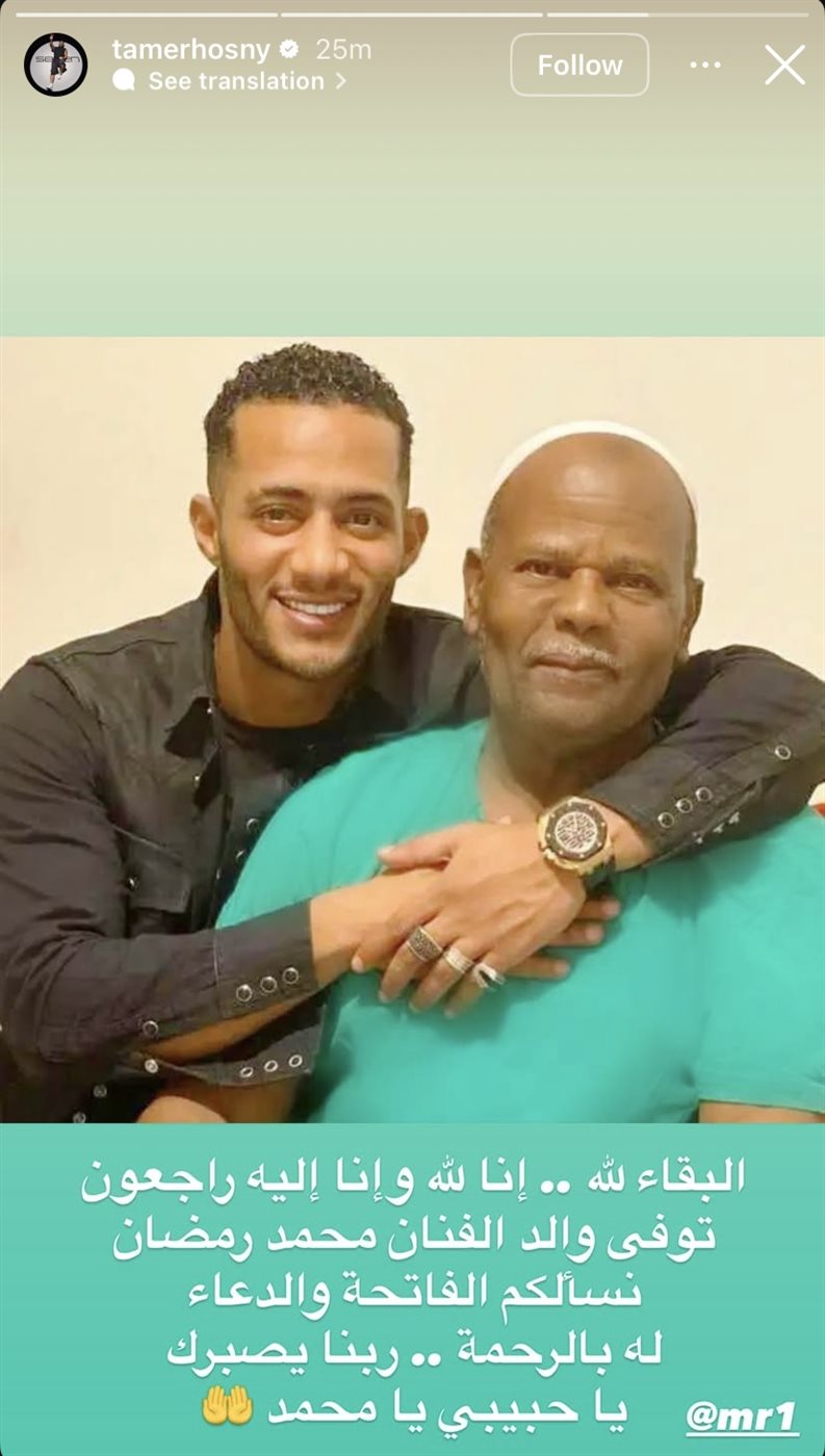 و نشر تامر حسني صورة للفنان محمد رمضان مع والدة عبر خاصية استوري علي حسابه الرسمي بموقع “إنستجرام” كتب فيه: "البقاء لله .. إنا لله وإنا إليه راجعون، توفى والد الفنان محمد رمضان، نسألكم الفاتحة والدعاء له بالرحمة، ربنا يصبرك يا حبيبي يا محمد".