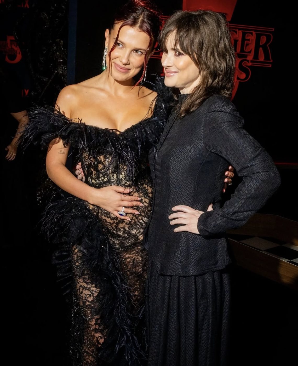 أما النجمة سادي سينك فقد تألقت بفستان كلاسيكي داكن الألوان أضفى عليها لمسة غموض وأناقة، بينما اختارت وينونا رايدر إطلالة مستوحاة من أجواء الثمانينيات، لتعيد إلى الأذهان بدايات شخصيتها المميزة في العمل. وقد بدا الانسجام واضحًا بين أفراد الفريق الذين أعادوا للجمهور مشاعر الحنين للمواسم السابقة.