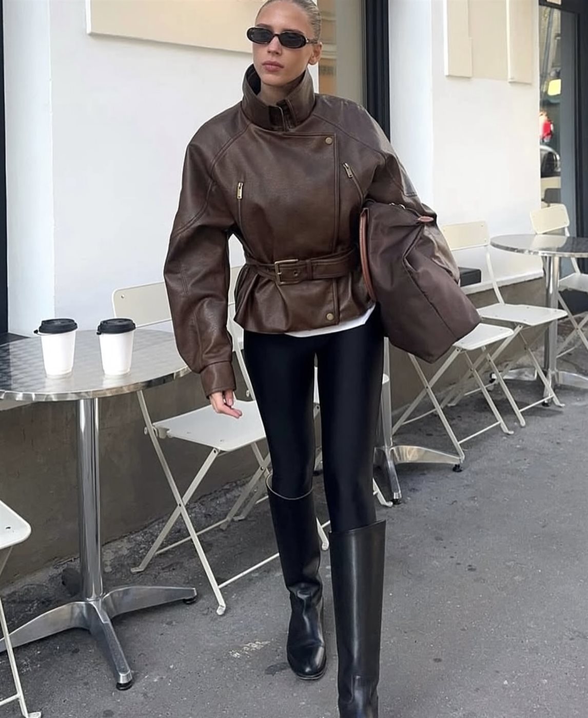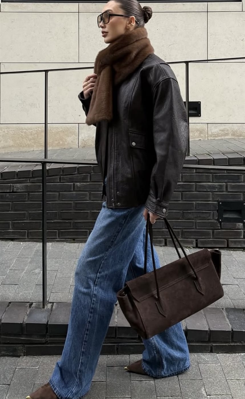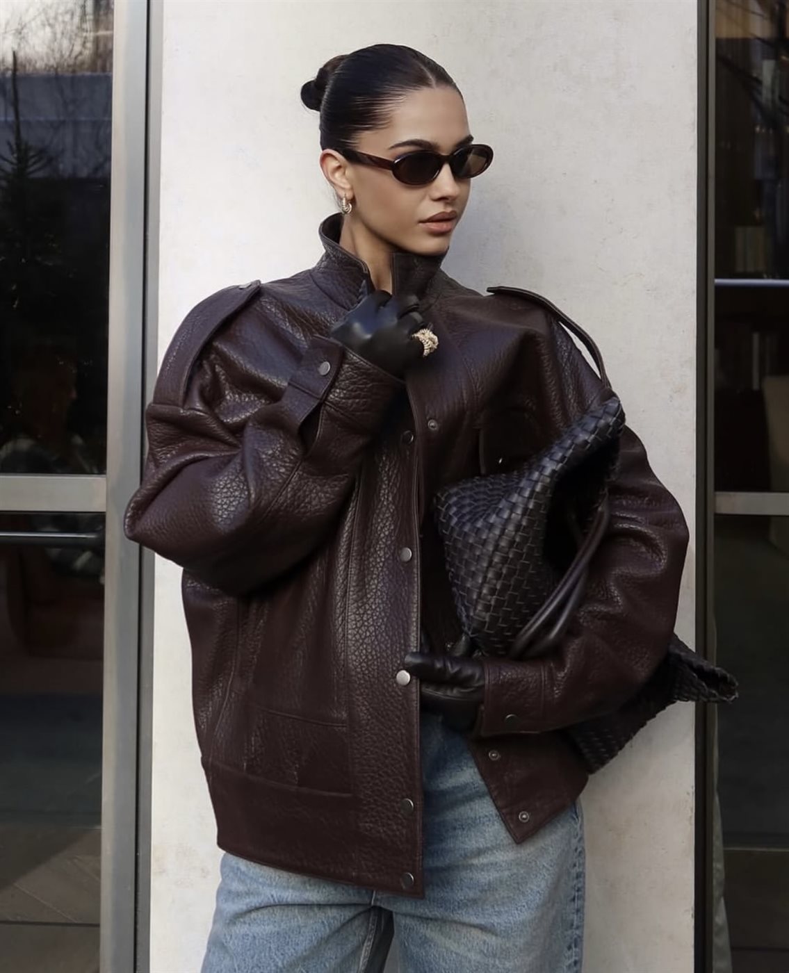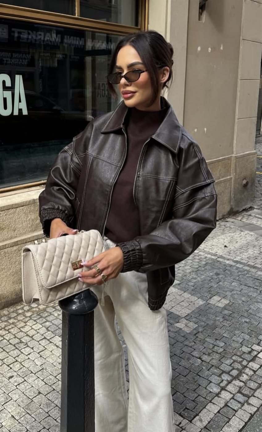 وما يميز الجاكيت البُني هو لونه الدافئ الذي يكسر رتابة الأسود التقليدي ويضفي شعورًا بالدفء والنعومة البصرية. فالجلد البُني ظهر كبديل أنيق للجلد الأسود في هذا الموسم مع تنوّع القصّات من البايكر إلى البومبر.