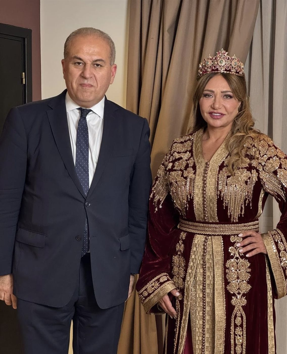 اختارت ليلى علوي قفطاناً مغربياً فاخراً من المخمل العنّابي المطرّز بخيوط ذهبية غنية بالتفاصيل الدقيقة، حمل لمسة ملكية بامتياز. التصميم تميّز بتطريزات يدوية على الصدر والأكمام والأطراف، مع خيوط متدلّية تضيف حركة فنية راقية. أما الحزام الذهبي الرقيق الذي يحدد الخصر فزاد الإطلالة توازناً وأناقة، مع المحافظة على الطابع التراثي الأصيل.