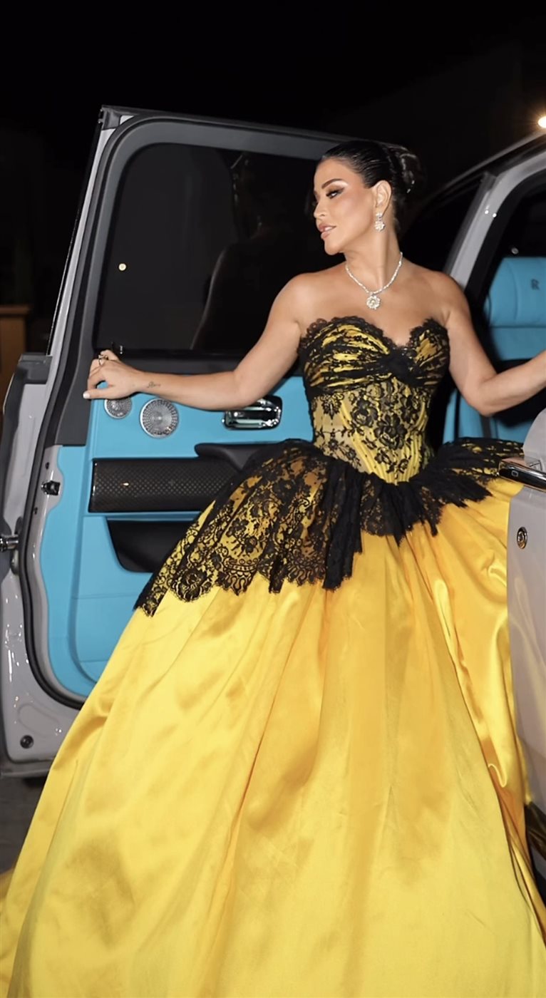 ظهرت جومانا مراد بفستان أصفر ضخم من تصميم اللبناني إيليو أبو فايصل (Elio Aboufayssal)، تميّز بتصميمه الفاخر الذي جمع بين الجرأة والأنوثة. الفستان صُمم من قماش فاخر يكسوه الدانتيل الأسود الناعم الذي أضاف لمسة درامية راقية، فبدت الإطلالة وكأنها مستوحاة من أناقة القصور الأوروبية القديمة ممزوجة بروح عربية أصيلة. أما القصة الواسعة للفستان فزادت من فخامته ومنحته حضورًا ملكيًا على السجادة الحمراء.