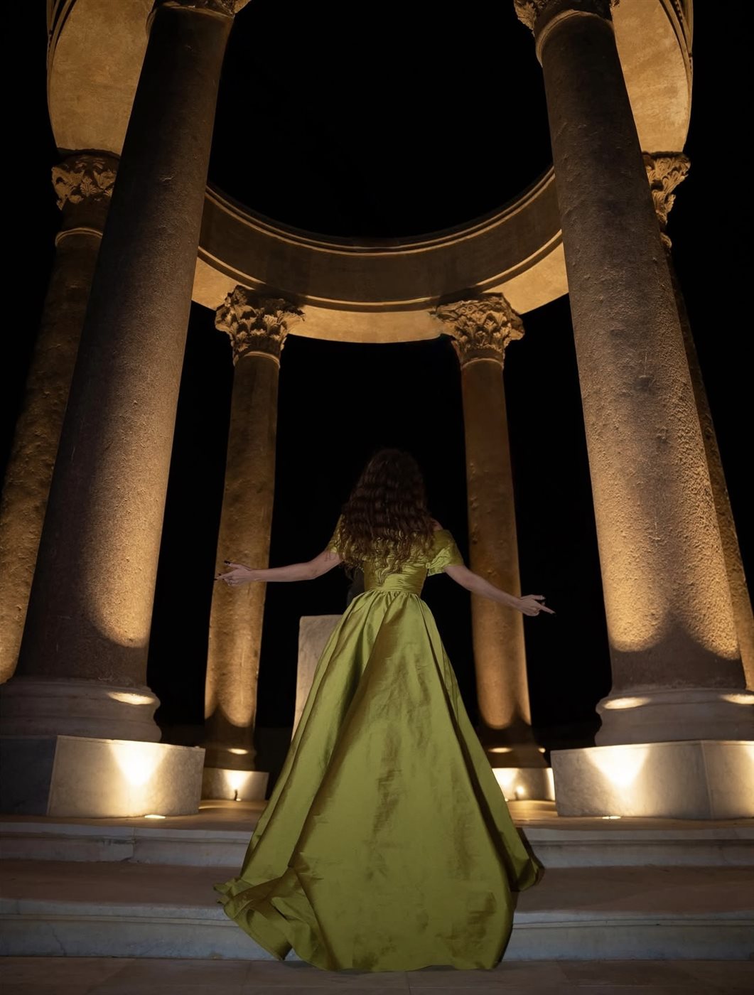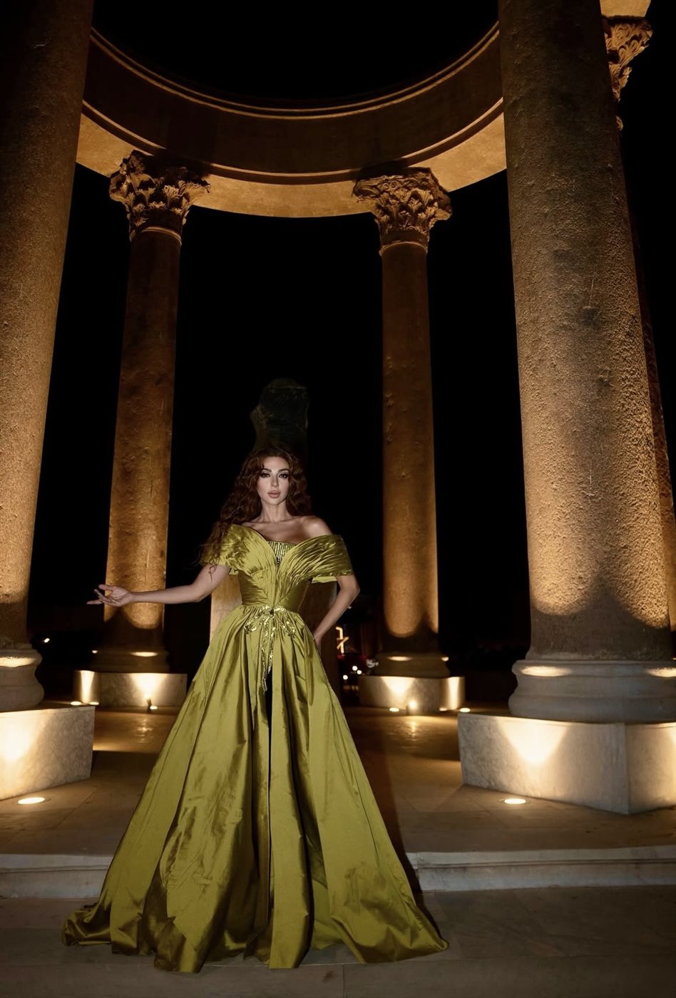 وق اعتمدت ميريام تسريحة شعر ويفي طويل منسدل على كتفيها، زاد من نعومة الإطلالة، فيما اختارت مكياجاً درامياً ارتكز على العيون المحددة بالكحل الأسود والشفاه النود الفاتحة، ليُبرز ملامحها الشرقية الجذابة. كما نسّقت إطلالتها مع مجوهرات بسيطة لتترك التركيز على الفستان اللافت والإضاءة المحيطة بها، والتي صمّمت لتمنح المشهد طابعاً أسطورياً وسط الأعمدة المضيئة التي بدت كأنها جزء من عرض فني متكامل.