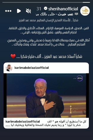 ووجهت شريهان في رسالة لها عبر “ستوري” على حسابها الرسمي بموقع الصور والفيديوهات الشهير “إنستجرام”، وكتبت له قائلة: “شكرًا للأستاذ المخرج الإنسان العظيم محمد عبد العزيز، الفن، الصدق، الدراسة الموهبة، الالتزام، العطاء، الأخلاق والخلق، الثقافة احترام النفس والغير، عشق الفن واحترامه، الوعي”.