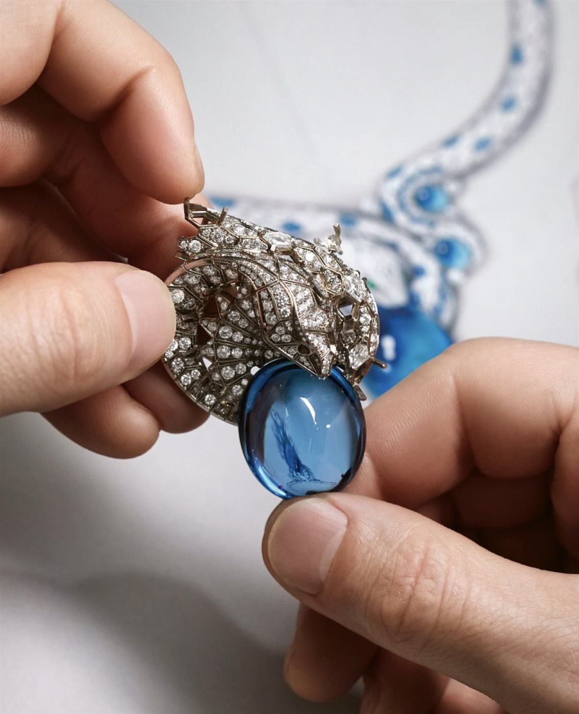 ويُعد عقد Najaatra تجسيدًا حيًا لفلسفة كارتييه في الابتكار، حيث يمتدّ سوار الكوبرا المصنوع من مزيج دقيق من ألماسٍ مشذّب وتورمالين مصقول إلى أعلى مستويات الدقة. تبرز الحراشف المرصّعة على طول التصميم بحرفية تُعيد التأكيد على مكانة الدار كإحدى أهم بيوت المجوهرات في العالم. ويأتي العنصر الأكثر لفتًا للأنظار في مركز العقد: حجر أكوامارين استثنائي يزن 51.70 قيراطًا، يشعّ بلون أزرق صافٍ يعكس نقاء البحر وعمقه.