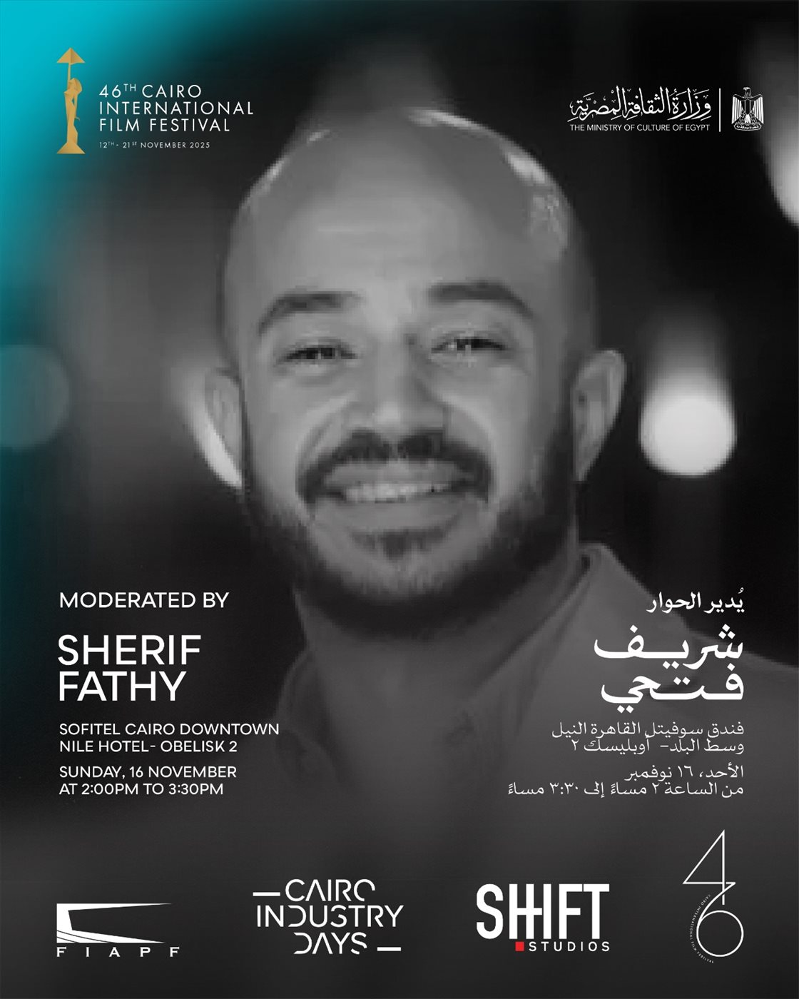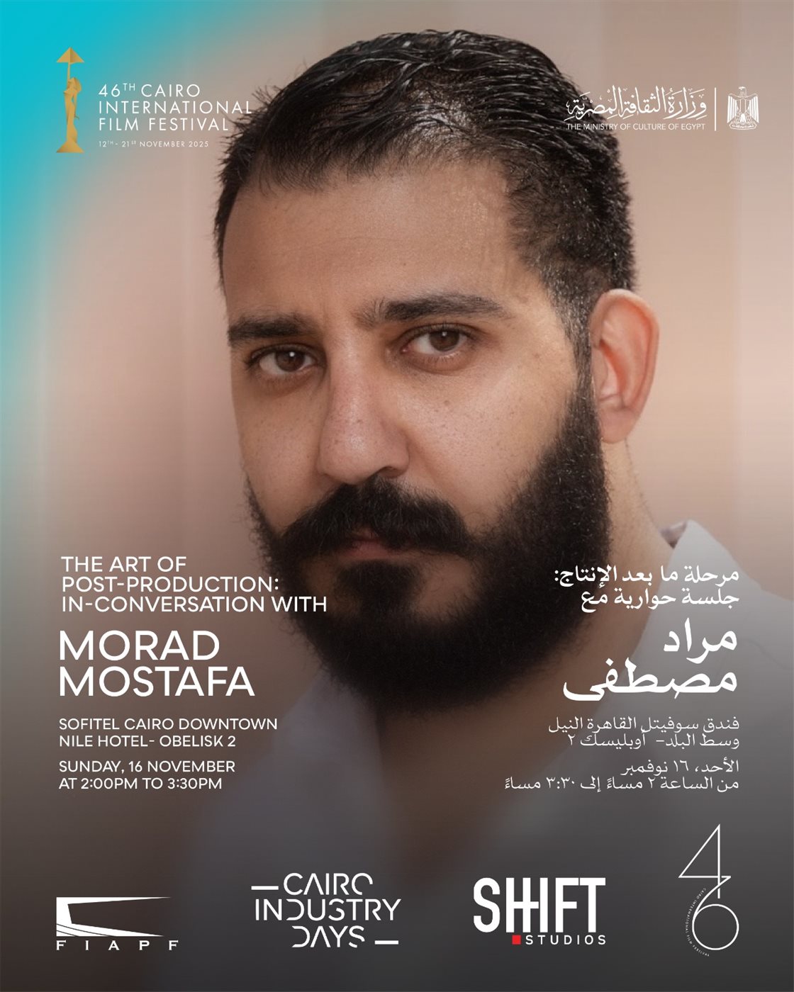 في إطار فعاليات أيام القاهرة لصناعة السينما المقامة ضمن الدورة الـ46 من مهرجان القاهرة السينمائي الدولي، يستضيف فندق سوفتيل – قاعة أوبليسك 2 اليوم الأحد 16 نوفمبر جلسة نقاشية بعنوان "مرحلة ما بعد الإنتاج مع مراد مصطفى وشريف فتحي – بدعم من استوديوهات شيفت"، وذلك في تمام الساعة 3:00 حتى 4:30 مساءً، وبحضور مخصص لحاملي البطاقات.