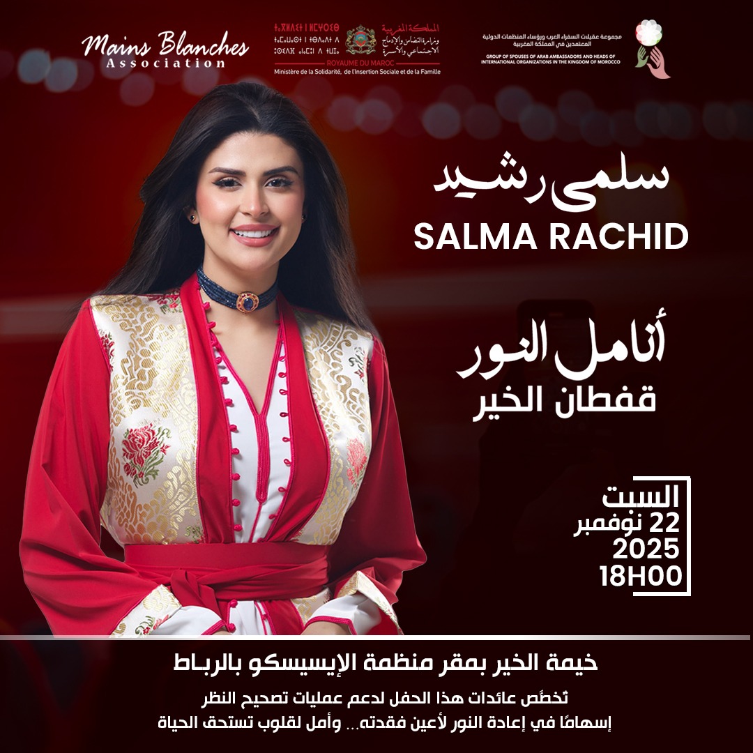 في مبادرة فنية إنسانية تعكس دور الإبداع في خدمة المجتمع، تستعد النجمة المغربية سلمى رشيد لإحياء حفل خيري استثنائي يوم 22 نوفمبر 2025 داخل خيمة الخير بمقر منظمة الإيسيسكو في الرباط، وذلك احتفاءً بالذكرى الخمسين للمسيرة الخضراء. ويخصص هذا الحفل بالكامل لدعم عمليات تصحيح النظر لفائدة الفئات المحتاجة، في خطوة تهدف إلى إعادة النور لمن فقدوه، وبث الأمل في نفوس من ينتظرون فرصة لرؤية الحياة بوضوح من جديد.