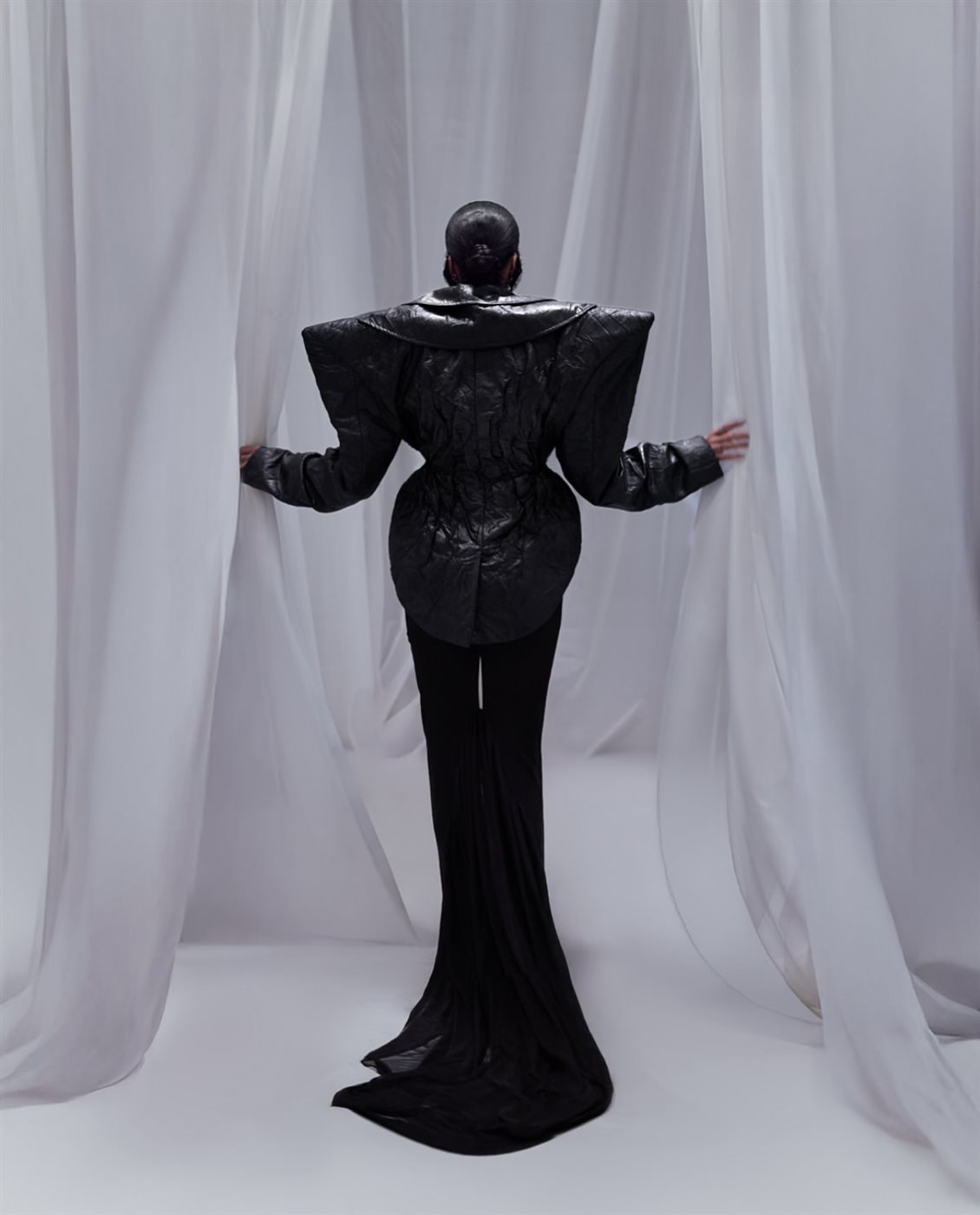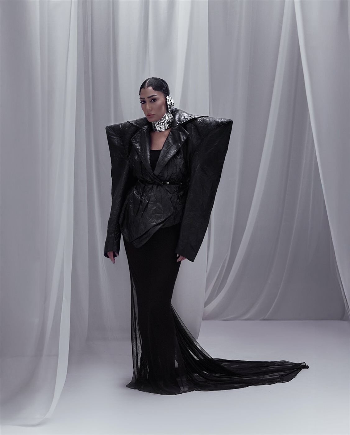 من النظرة الأولى، تبرز قوة التصميم الأسود الذي اعتمدت عليه، بكتفين حادّين ضخمَين يضيفان طابعًا دراميًا يذكرنا بعوالم الخيال العلمي. القماشة المضلّعة والملمس اللامع يخلقان إحساسًا بصريًا متفردًا، بينما ينسدل الجزء السفلي من الإطلالة بشكل انسيابي مع ذيل طويل يمنحها حضورًا مسرحيًا لافتًا. أما العنصر الأكثر جرأة فكان الإكسسوارات المعدنية الفضية التي التفّت حول الرقبة والأذنين، بتصميم هندسي يعكس روحًا مستقبلية قوية ويجعل ملامحها أكثر حدّة وقوة.