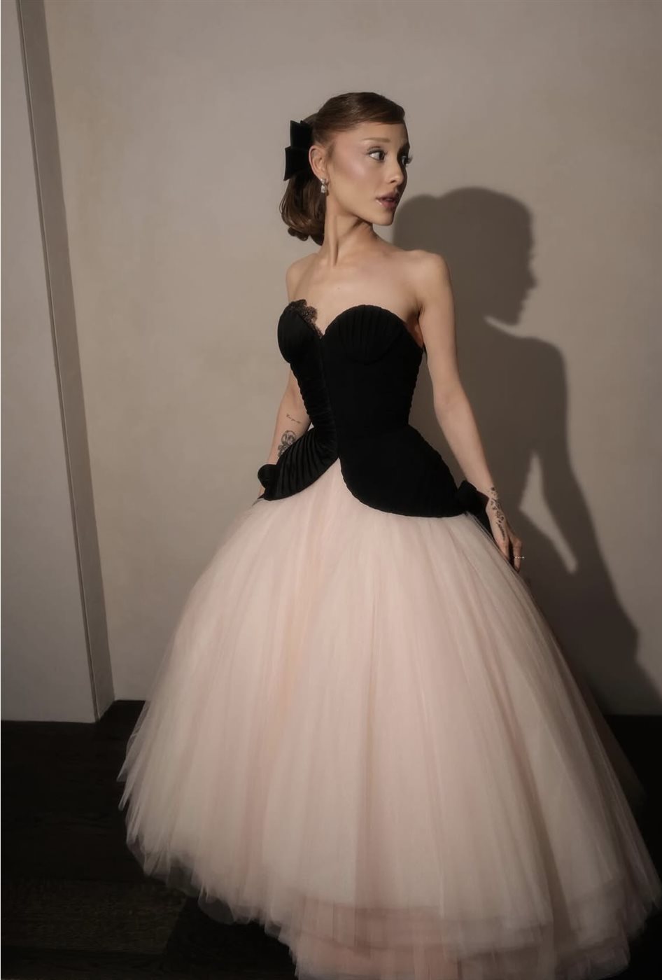اعتمدت أريانا غراندي فستان سهرة درامياً بمواصفات دقيقة تجمع بين الفخامة والحِرفية العالية. جاء تصميم الجزء العلوي بقالب كورسيه فاخر من الكريب الأسود والساتان، مشدوداً بطريقة لافتة عند الظهر عبر نظام ربط دقيق يبرز رشاقة خصرها ويمنح الفستان شكله الهيكلي المتقن. ولتعزيز الطابع الأنثوي الناعم، أضيفت ربطات جانبية رقيقة عند الخصر، بينما تزيّن الصدر بتطريز Keyhole الأيقوني الخاص بشياپاريللي، والذي تحوّل إلى عنصر بصري محوري يلتقط الضوء ويضفي لمسة فنية على الإطلالة.