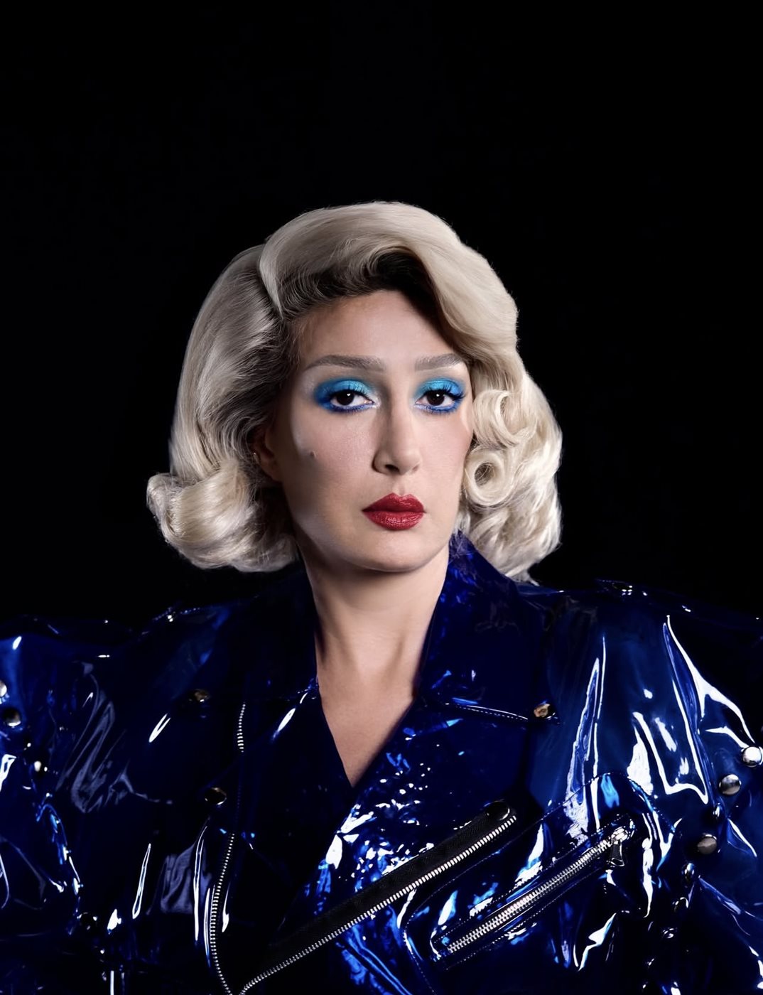 الماكياج لعب دوراً محورياً في اكتمال هذا المشهد الجريء؛ إذ اعتمدت Makeup Artist mariaura على لوك درامي بظلال عيون أزرق كهربائي يمتد على الجفن بشكل هندسي، مع شفاه حمراء قوية تمنح توازناً بين الجرأة والأنوثة. أما الشعر، بإشراف rraheemxx، فجاء بتسريحة كلاسيكية مموجة بستايل هوليوود الذهبي القديم، ما خلق مفارقة فنية بديعة بين الحداثة والصورة السينمائية العتيقة.