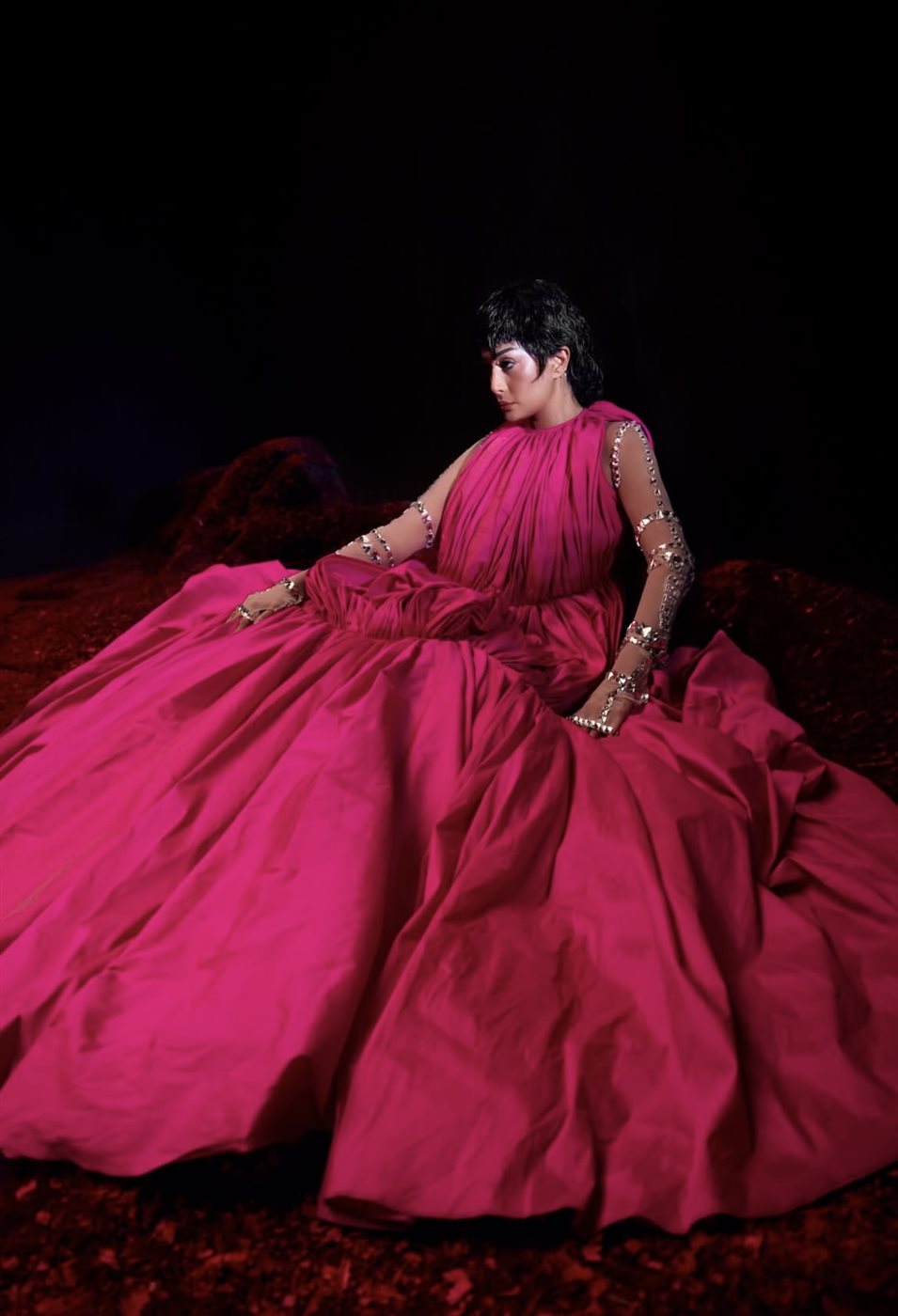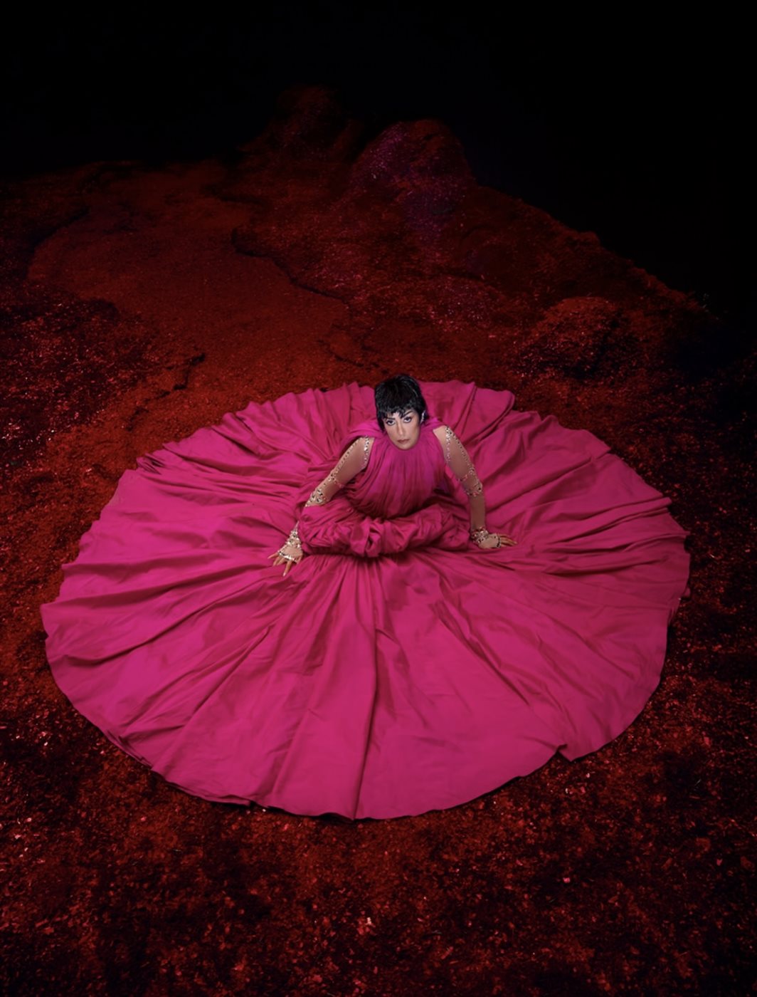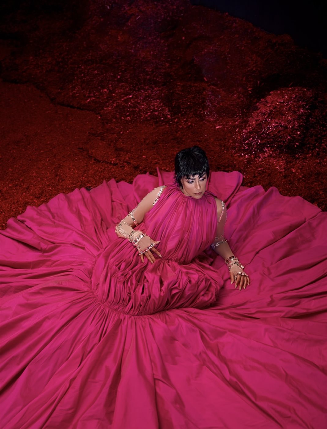 الفستان الذي يتّسم بتصميم دائري واسع للغاية ينساب حول النجمة كلوحة فنية، جاء بقماش لامع بدرجات الفوشيا القوية، مع قصّة علوية Draped ناعمة تبرز الأكتاف وتزيد من فخامة الإطلالة. أما محيط الفستان الواسع فخلق هالة مسرحية تحاكي أجواء عروض الأزياء الراقية وتحوّل المشهد بأكمله إلى قطعة فنية متكاملة. وقد ساهمت الخلفية الحمراء اللامعة في تعميق التأثير البصري للصورة، مضيفة طابعاً درامياً يعزّز قوة اللون ويضع غادة في قلب تكوين فني مميز.