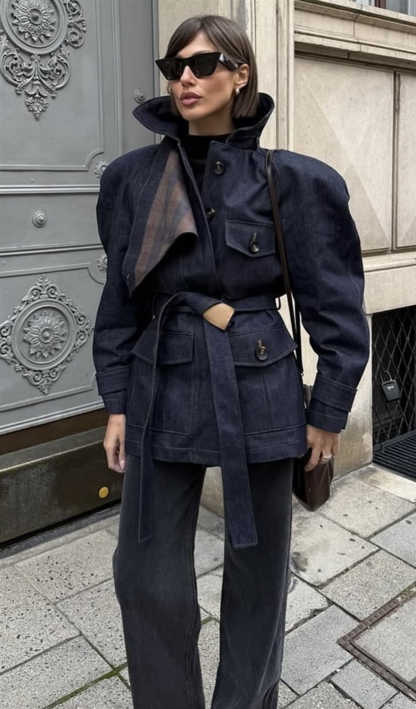 ويظهر هذا الاتجاه بقوة في عروض الأزياء العالمية، حيث قدّمته دور مثل Celine، Dior، Alexander McQueen، وBalenciaga بلمسات حديثة، سواء عبر الجاكيتات الهيكلية، البنطلونات المستقيمة، أو التنانير الطويلة التي عادت إلى الواجهة. كما لم تتردد النجمات في اعتماد هذه الصيحة، إذ تألقت كل من بيلا حديد ببنطلون دينم داكن عالي الخصر منسّق مع قميص قطني أبيض لإطلالة نهارية منمّقة، فيما ظهرت هايلي بيبر ببدلة دينم داكن كاملة من ذلك النوع الذي يجمع بين الرسمية والStreet style. أما ريهانا فاختارتها بأسلوب درامي عبر معطف دينم داكن طويل مع إكسسوارات ذهبية عريضة. ومن العالم العربي، ظهرت سيرين عبدالنور ومهيرة عبد العزيز بإطلالات دينم داكن أنيقة خلال إطلالات إعلامية وتصوير جلسات خاصة.