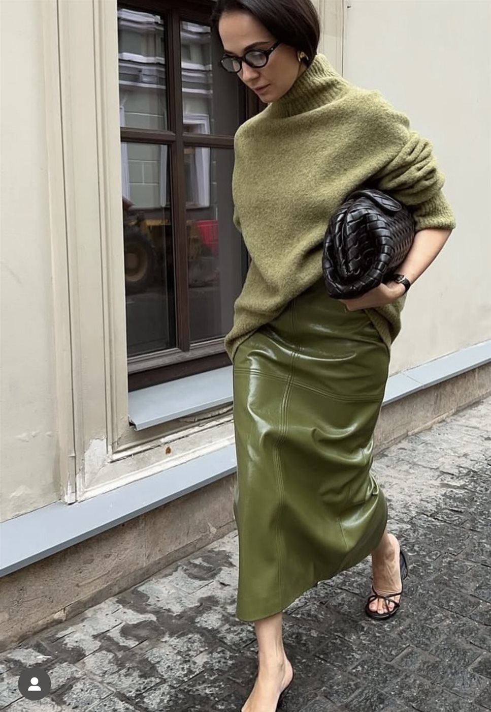 بدلة باللون الأخضر الزيتوني أو العشبي تضيف حضوراً واثقاً وقوياً، خصوصاً مع حقيبة محايدة وحذاء Nude. - إطلالة كاجوال: