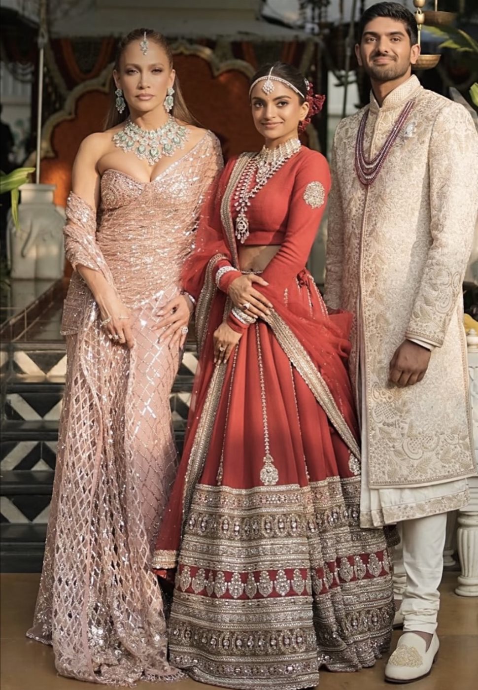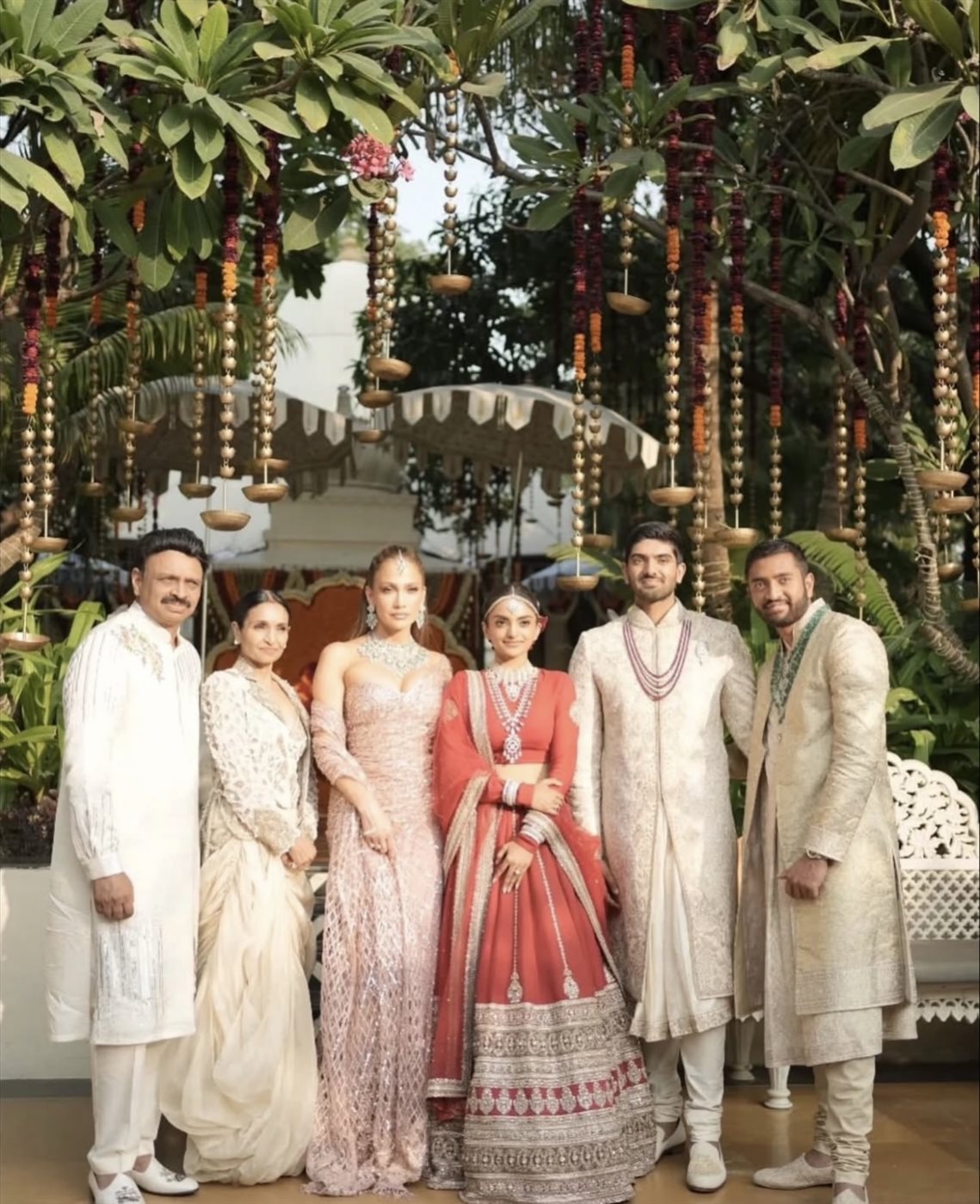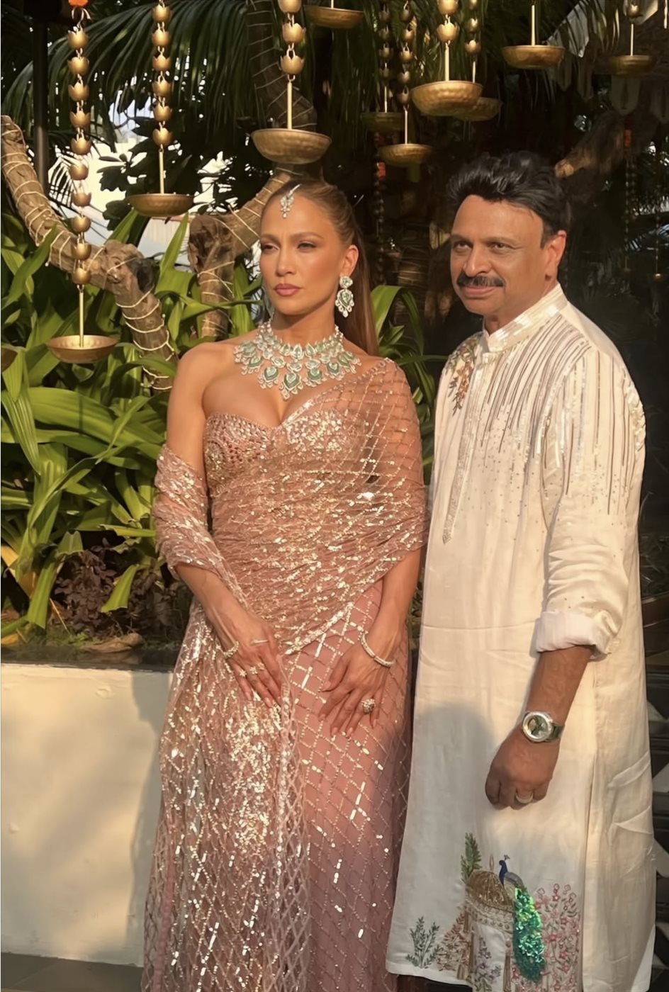 وقد اختارت جينيفر لوبيز ساريًا ورديًا مطرّزًا من توقيع المصمم الهندي الشهير مانيش مالهوترا، أحد أهم الأسماء في عالم الأزياء الهندية وصاحب بصمات مميزة في إطلالات نجمات بوليوود. وقد جاء الساري بتصميم استثنائي يجمع بين النقوش الهندية التقليدية والتطريزات الدقيقة الراقية، ما منح الإطلالة طابعًا ملكيًا متناغمًا مع أجواء الاحتفال الأسطوري في أودايبور، المدينة التي لطالما ارتبط اسمها بالأعراس الفاخرة.