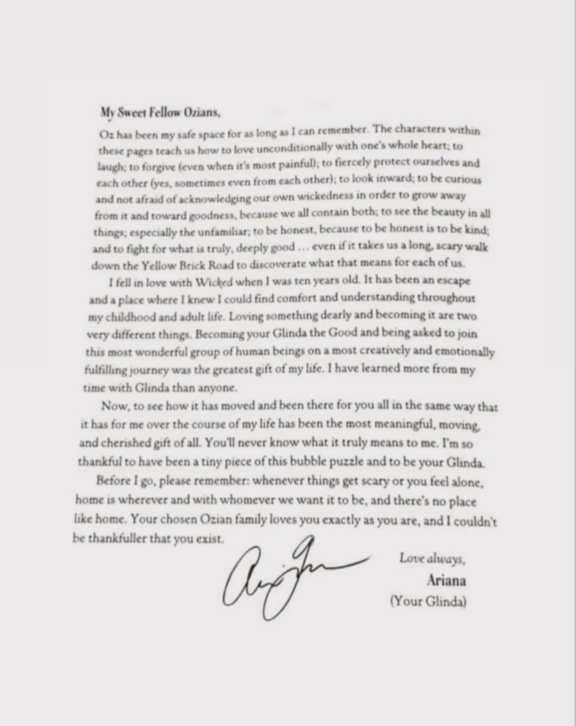 وكتبت آريانا في رسالتها: "أن أصبح غليندا الطيبة وأن أدعى للانضمام إلى هذه المجموعة الرائعة من البشر في رحلة إبداعية وعاطفية مُرضية كان أعظم هبة في حياتي و لقد تعلمت من وقتي مع غليندا أكثر من أي شخص آخر".