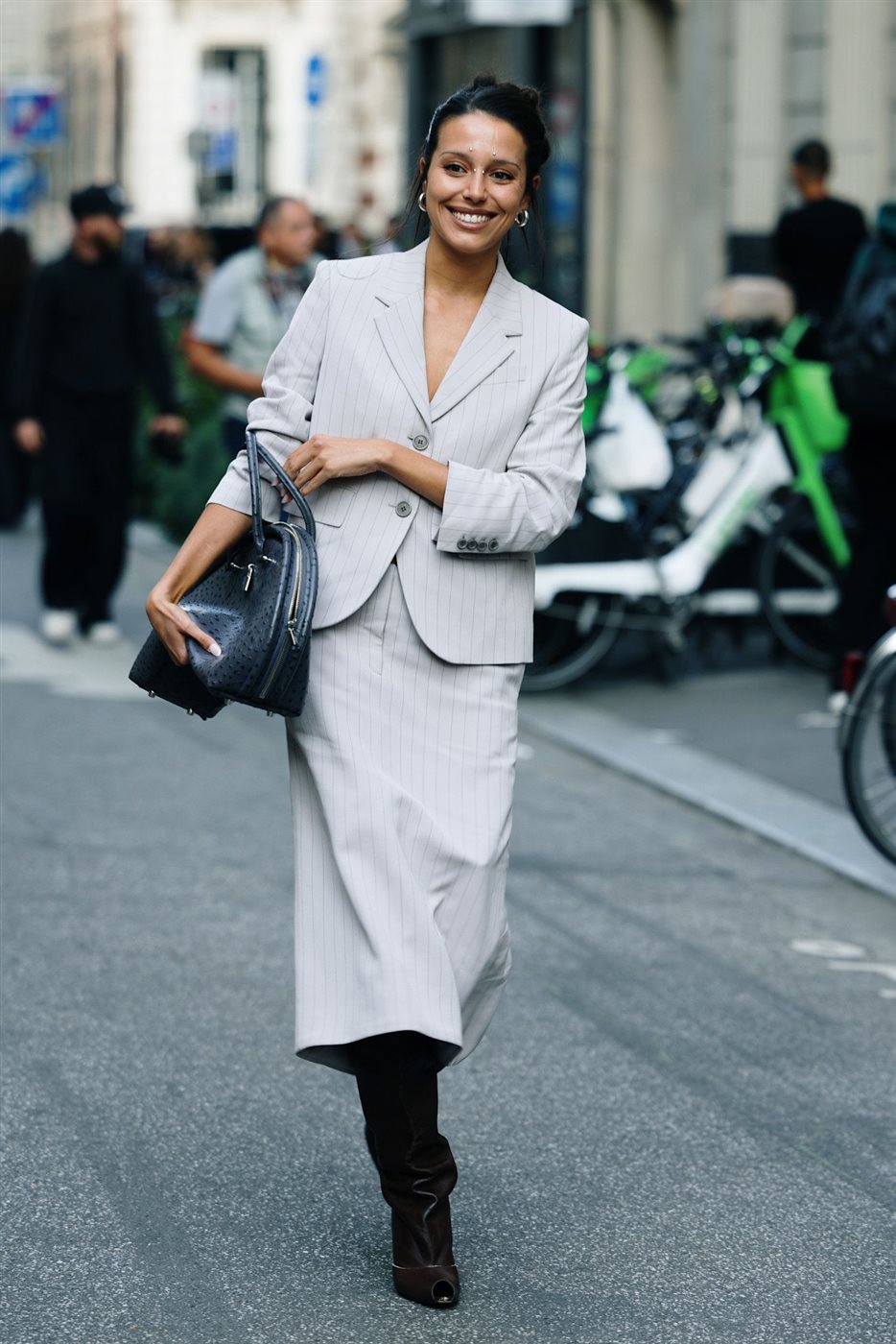 وفي إطلالة ثالثة، برز تنسيق الجينز المستقيم مع قميص بولو تحت البليزر، في مظهر أقرب إلى الستايل الجامعي الراقي، لكنه بلمسات عصرية تجعل القَصّة أنيقة دون مبالغة. بينما ذهب آخرون لخيار أكثر جرأة: الطقم المخطط بالكامل المستوحى من حقبة الثمانينيات، مع إضافة بوتات مريحة وعصرية لكسر الطابع الكلاسيكي الصارم.