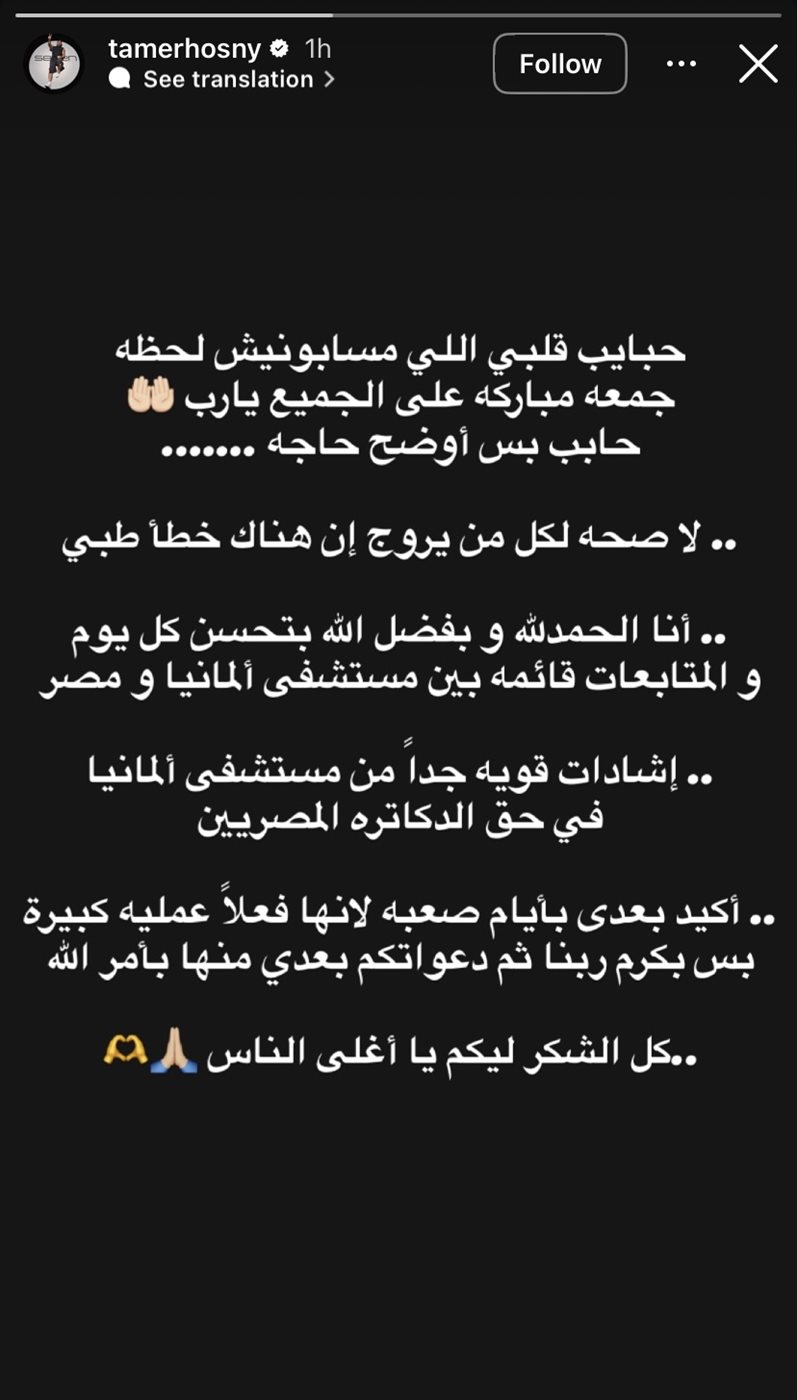 وكتب تامر حسني رسالة مؤثرة عبر خاصية الستوري على حسابه الرسمي في" إنستجرام"، قال فيها:"حبايب قلبي اللي مسابونيش لحظة جمعة مباركة على الجميع يا رب حابب أوضح ، لا صحة لكل من يروج إن هناك خطأ طبي أنا الحمد لله وبفضل الله بتحسن كل يوم والمتابعات قائمة بين مستشفى ألمانيا ومصر".